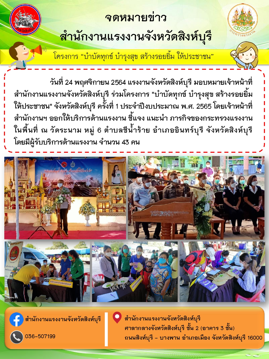 เเรงงานจังหวัดสิงห์บุรี ร่วมโครงการ “บำบัดทุกข์ บำรุงสุข สร้างรอยยิ้ม ให้ประชาชน” จังหวัดสิงห์บุรี ครั้งที่ 1 ประจำปีงบประมาณ พ.ศ. 2565