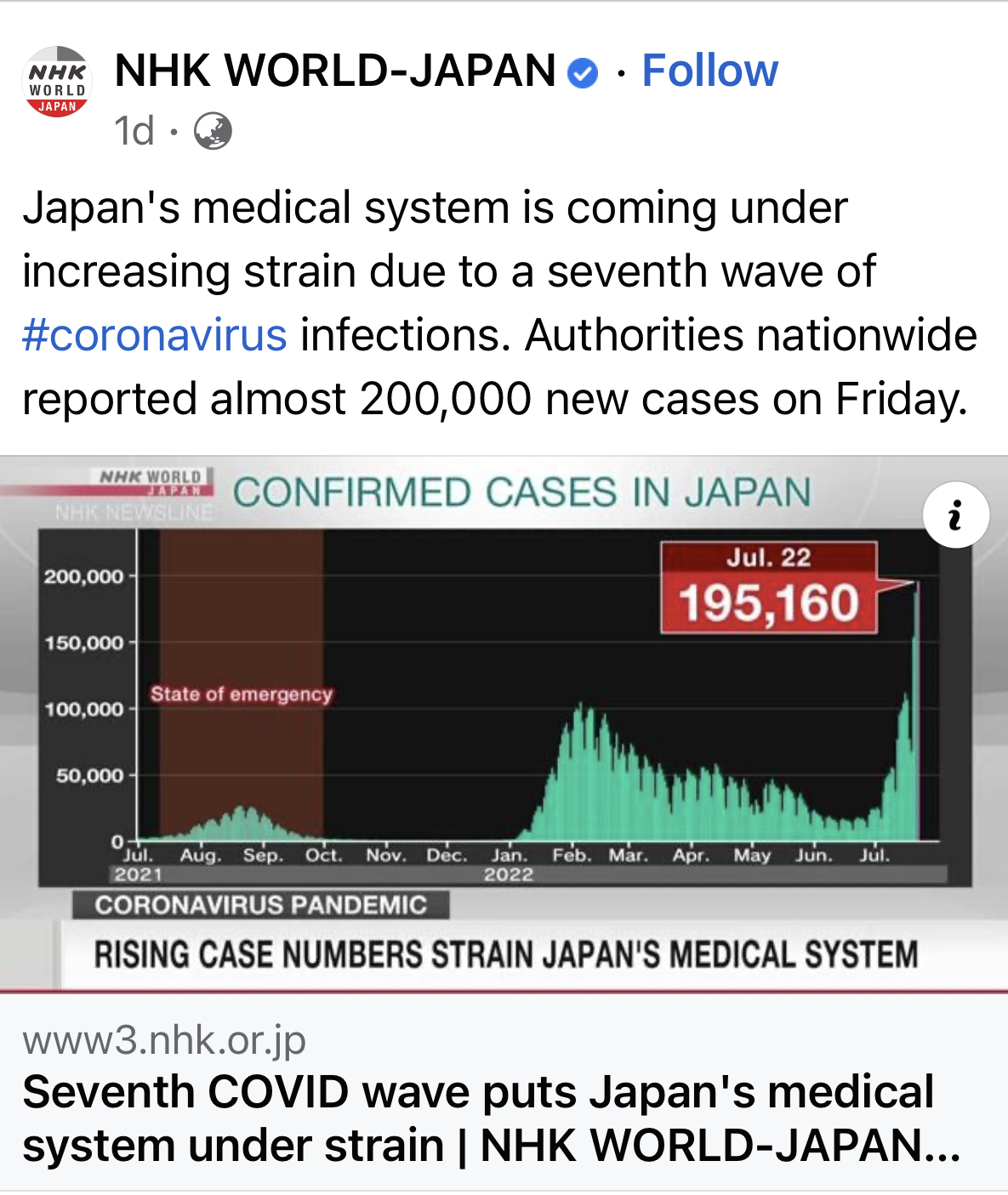 เมื่อวันที่ 22 กรกฎาคม 2565 มีผู้ติดเชื้อภายในญี่ปุ่นเพิ่มสูงขึ้นมากที่สุดเป็นสถิติใหม่ (New High) เกือบ 2 แสนคน และทำสถิติจำนวนผู้ติดเชื้อสูงมากที่สุดเป็นสถิติใหม่เป็นเวลา 3 วันติดต่อกัน