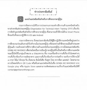 สำนักงานแรงงานในประเทศญี่ปุ่นขอประชาสัมพันธ์แนะนำแอปพลิเคชั่นสำหรับการศึกษาภาษาญี่ปุ่น จัดทำโดย องค์กรฝึกงานด่านเทคนิคสำหรับชาวต่างชาติแห่งประเทศญี่ปุ่น (Organization for Technical Intern Training (OTIT)) ซึ่งสามารถใช้งานได้กับ Smart Phone ทั้งระบบปฏิบัติการ iOS และ Android