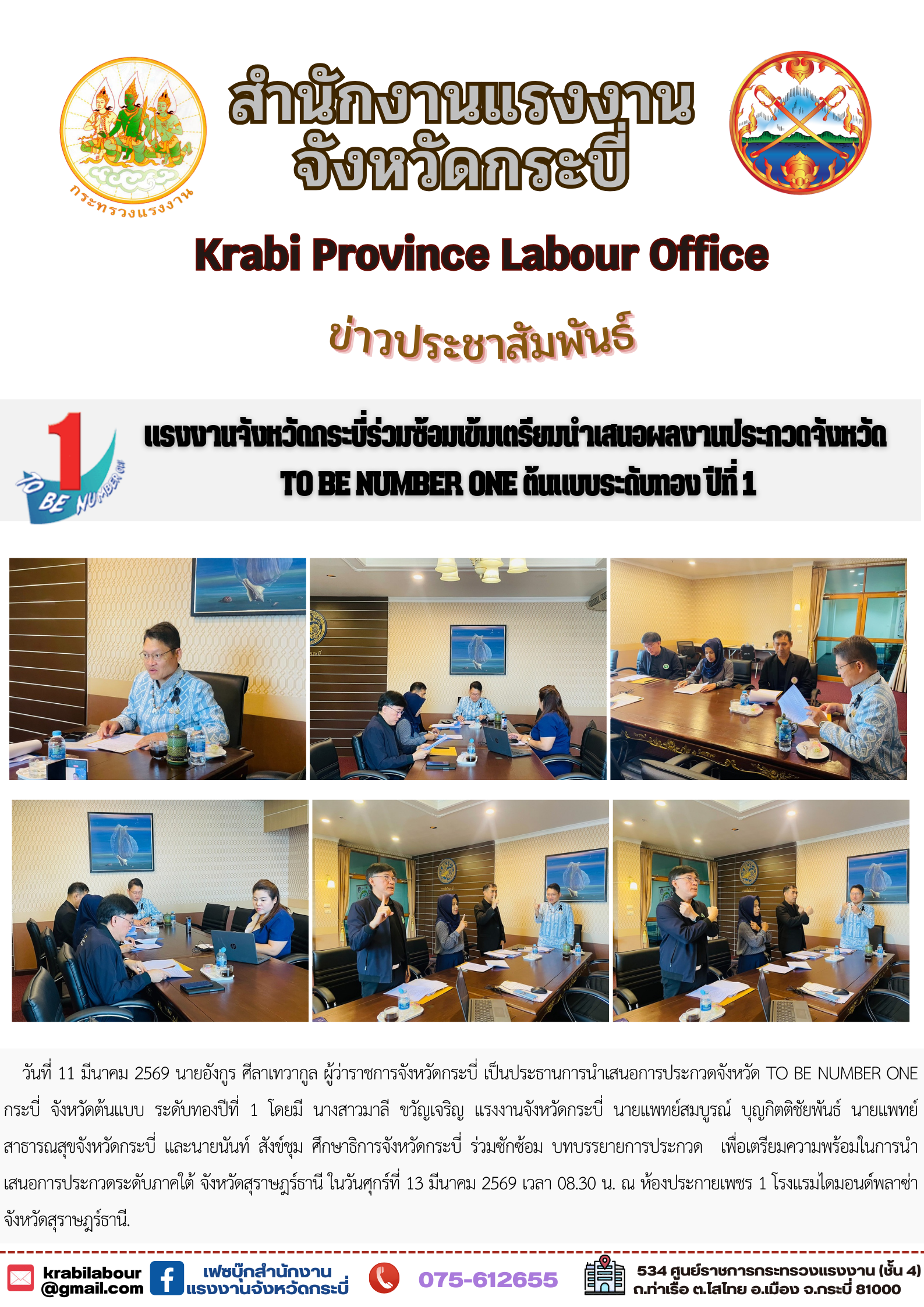แรงงานจังหวัดกระบี่ร่วมซ้อมเข้มเตรียมนำเสนอผลงานประกวดจังหวัด TO BE NUMBER ONE ต้นแบบระดับทอง ปีที่ 1