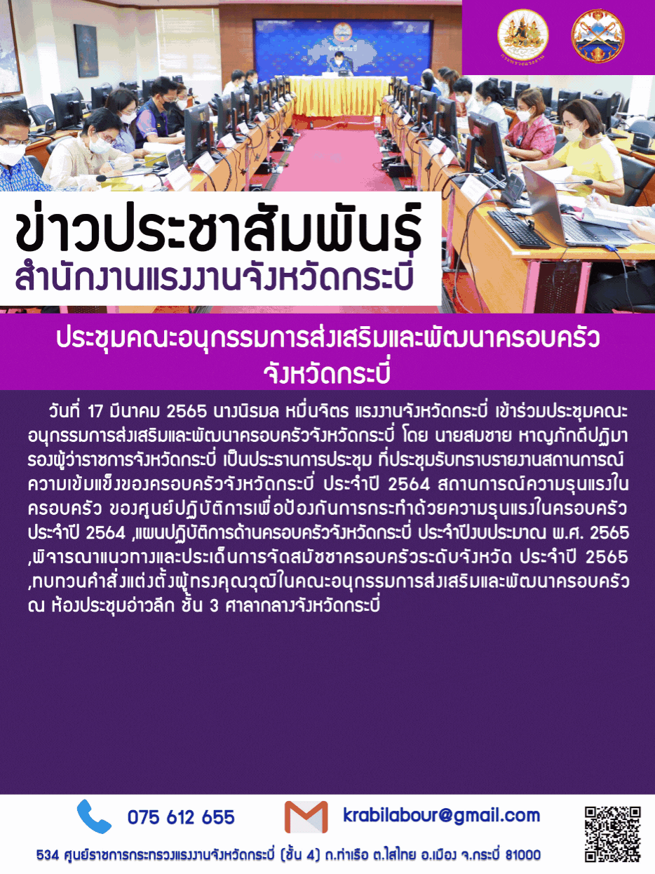 แรงงานจังหวัดกระบี่ร่วมประชุมคณะอนุกรรมการส่งเสริมและพัฒนาครอบครัวจังหวัดกระบี่