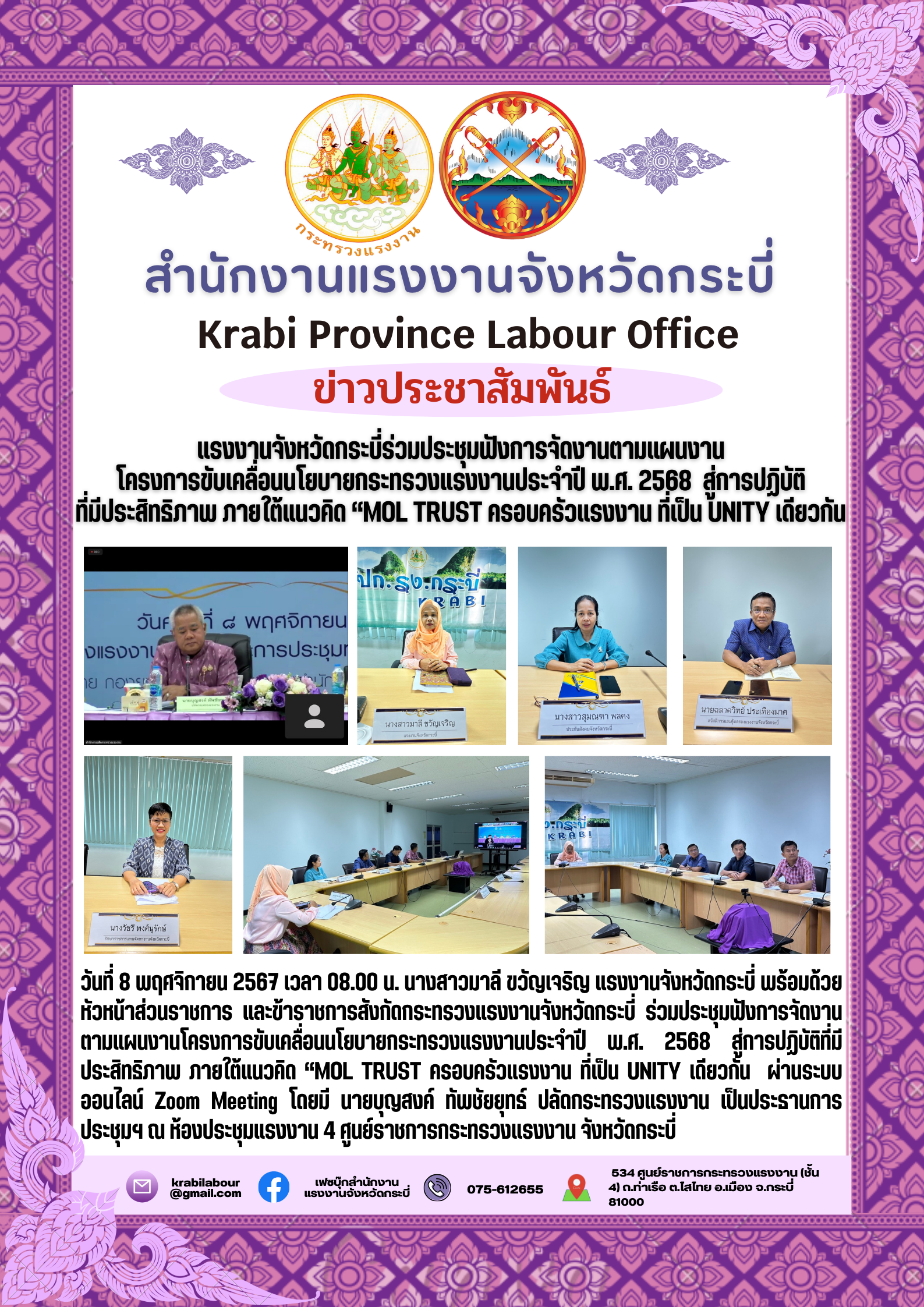 สรจ.กระบี่ร่วมประชุมฟังการจัดงานตามแผนงาน โครงการขับเคลื่อนนโยบายกระทรวงแรงงานประจำปี พ.ศ. 2568 สู่การปฏิบัติ ที่มีประสิทธิภาพ ภายใต้แนวคิด “MOL TRUST ครอบครัวแรงงาน ที่เป็น UNITY เดียวกัน