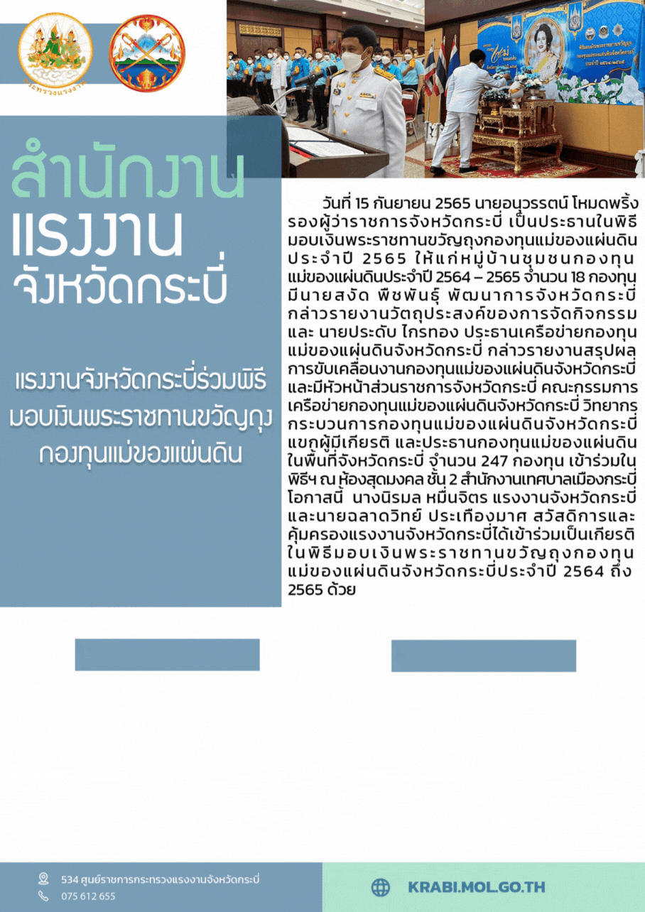 แรงงานจังหวัดกระบี่ร่วมพิธี มอบเงินพระราชทานขวัญถุง กองทุนแม่ของแผ่นดิน