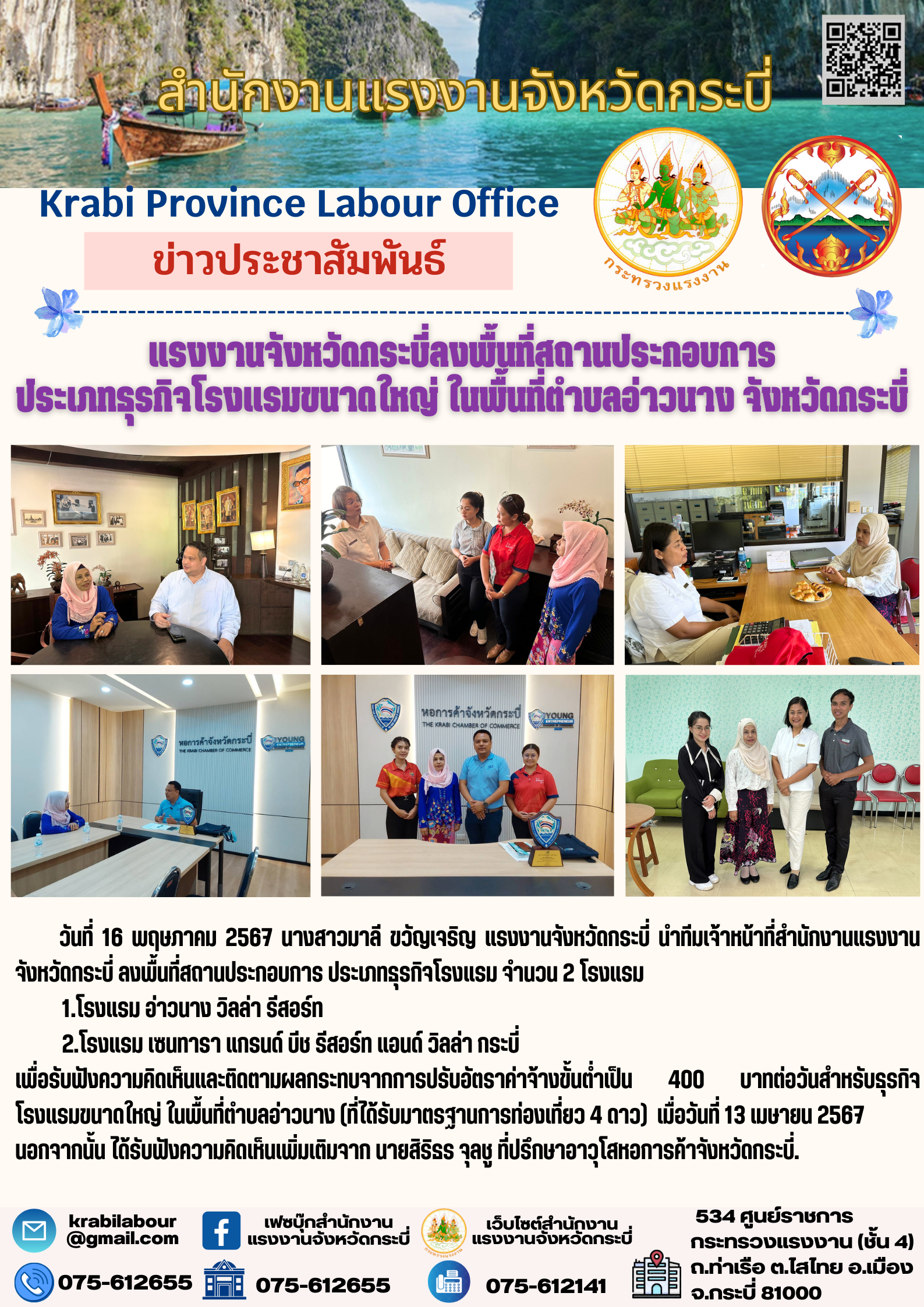 แรงงานจังหวัดกระบี่ลงพื้นที่สถานประกอบการ ประเภทธุรกิจโรงแรมขนาดใหญ่ ในพื้นที่ตำบลอ่าวนาง จังหวัดกระบี่