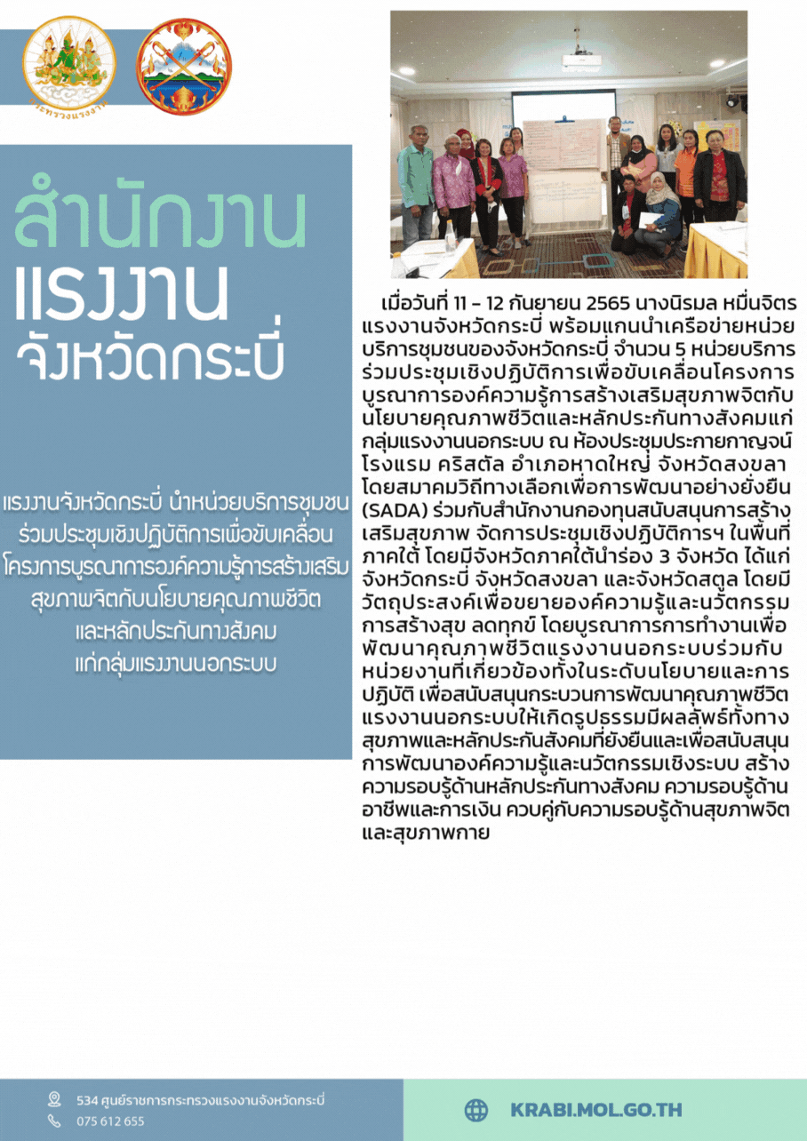 แรงงานจังหวัดกระบี่ นำหน่วยบริการชุมชนร่วมประชุมเชิงปฏิบัติการเพื่อขับเคลื่อนโครงการบูรณาการองค์ความรู้การสร้างเสริมสุขภาพจิตกับนโยบายคุณภาพชีวิตและหลักประกันทางสังคมแก่กลุ่มแรงงานนอกระบบ Pll_you_are_here เมนูหลัก ข่าวสาร กระบี่