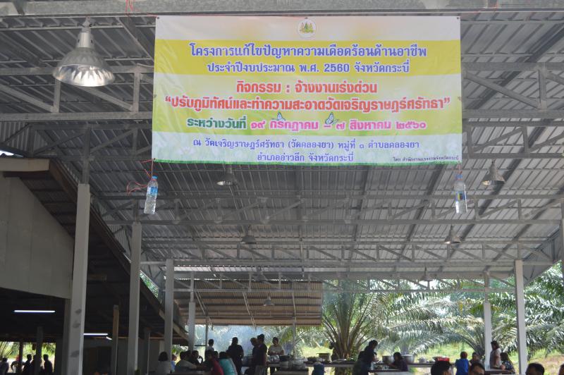 เมื่อวันนี้ 19 กรกฎาคม 2560 เวลา 10.00 น. พันจ่าเอกไพฑูรย์ น่วมสวัสดิ์ แรงงานจังหวัดกระบี่ เปิดโครงการแก้ไขปัญหาความเดือดร้อนด้านอาชีพ ประจำปีงบประมาณ พ.ศ. 2560 กิจกรรม : จ้างงานเร่งด่วน “ปรับภูมิทัศน์และทำความสะอาดวัดเจริญราษฎร์ศรัทธา” ที่จะดำเนินกิจกรรมระหว่างวันที่ 19 กรกฎาคม –7 สิงหาคม 2560 ณ วัดเจริญราษฎร์ศรัทธา (วัดคลองยา) หมู่ที่ 3 ตำบลคลองยา อำเภออ่าวลึก จังหวัดกระบี่ มีประชาชนที่ประสบปัญหาความเดือดร้อนด้านอาชีพ มีรายได้จากการจ้างงาน จำนวน 30 ราย