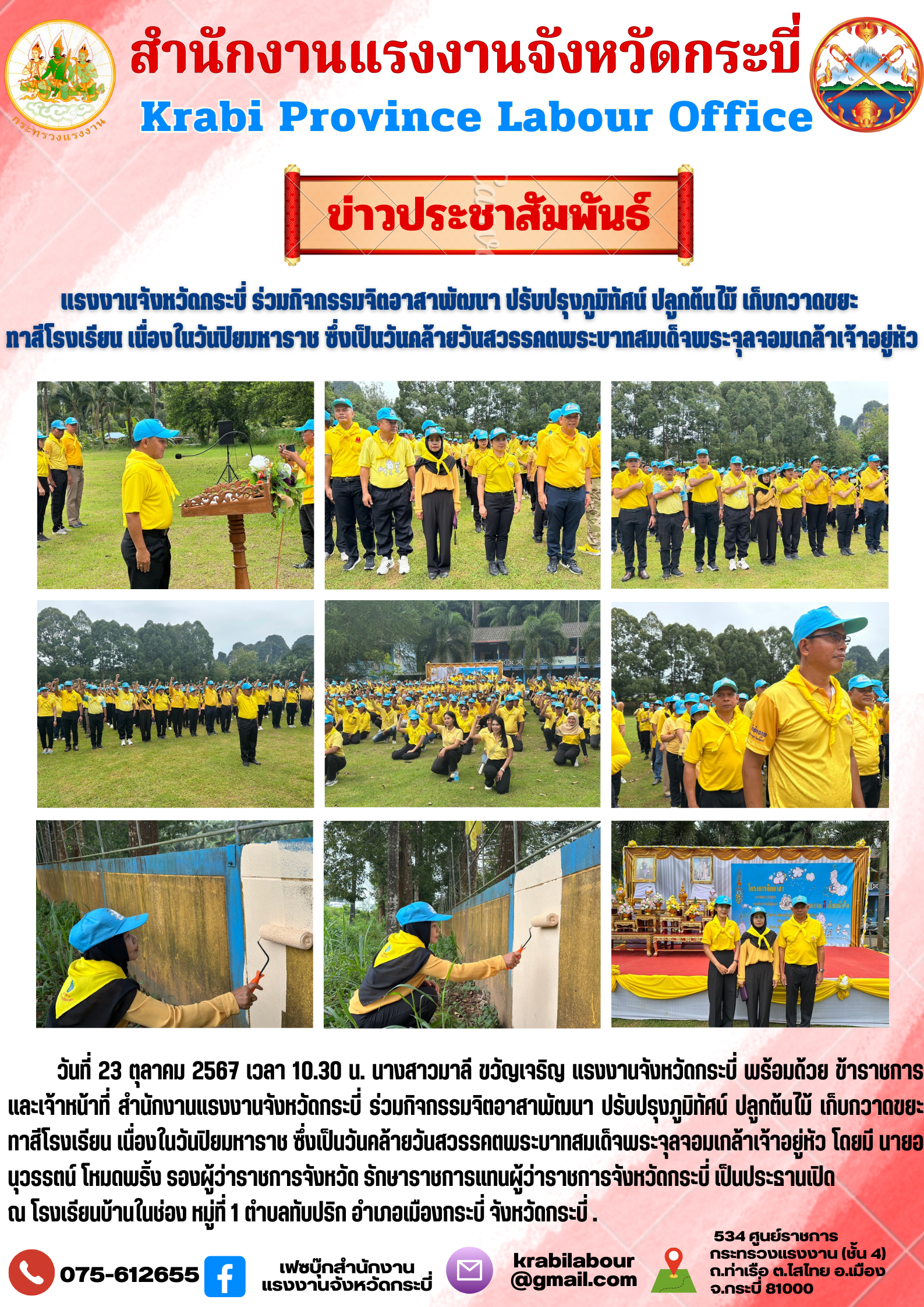 สรจ.กระบี่ ร่วมกิจกรรมจิตอาสาพัฒนา ปรับปรุงภูมิทัศน์ ปลูกต้นไม้ เก็บกวาดขยะ ทาสีโรงเรียน เนื่องในวันปิยมหาราช ซึ่งเป็นวันคล้ายวันสวรรคตพระบาทสมเด็จพระจุลจอมเกล้าเจ้าอยู่หัว