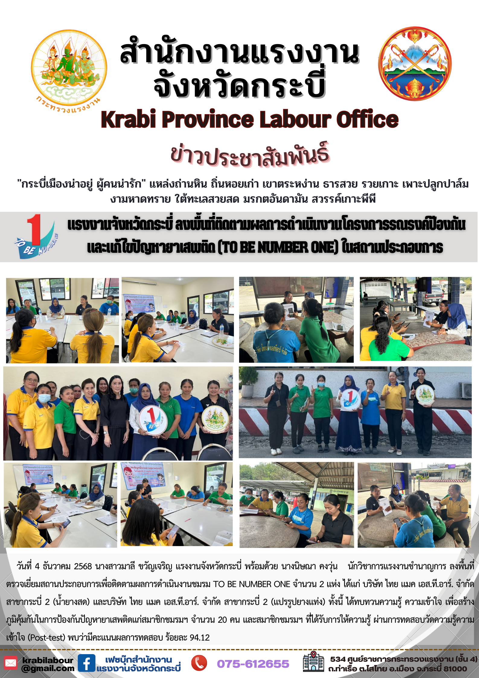 แรงงานจังหวัดกระบี่ ลงพื้นที่ติดตามผลการดำเนินงานโครงการรณรงค์ป้องกันและแก้ไขปัญหายาเสพติด (TO BE NUMBER ONE) ในสถานประกอบการ