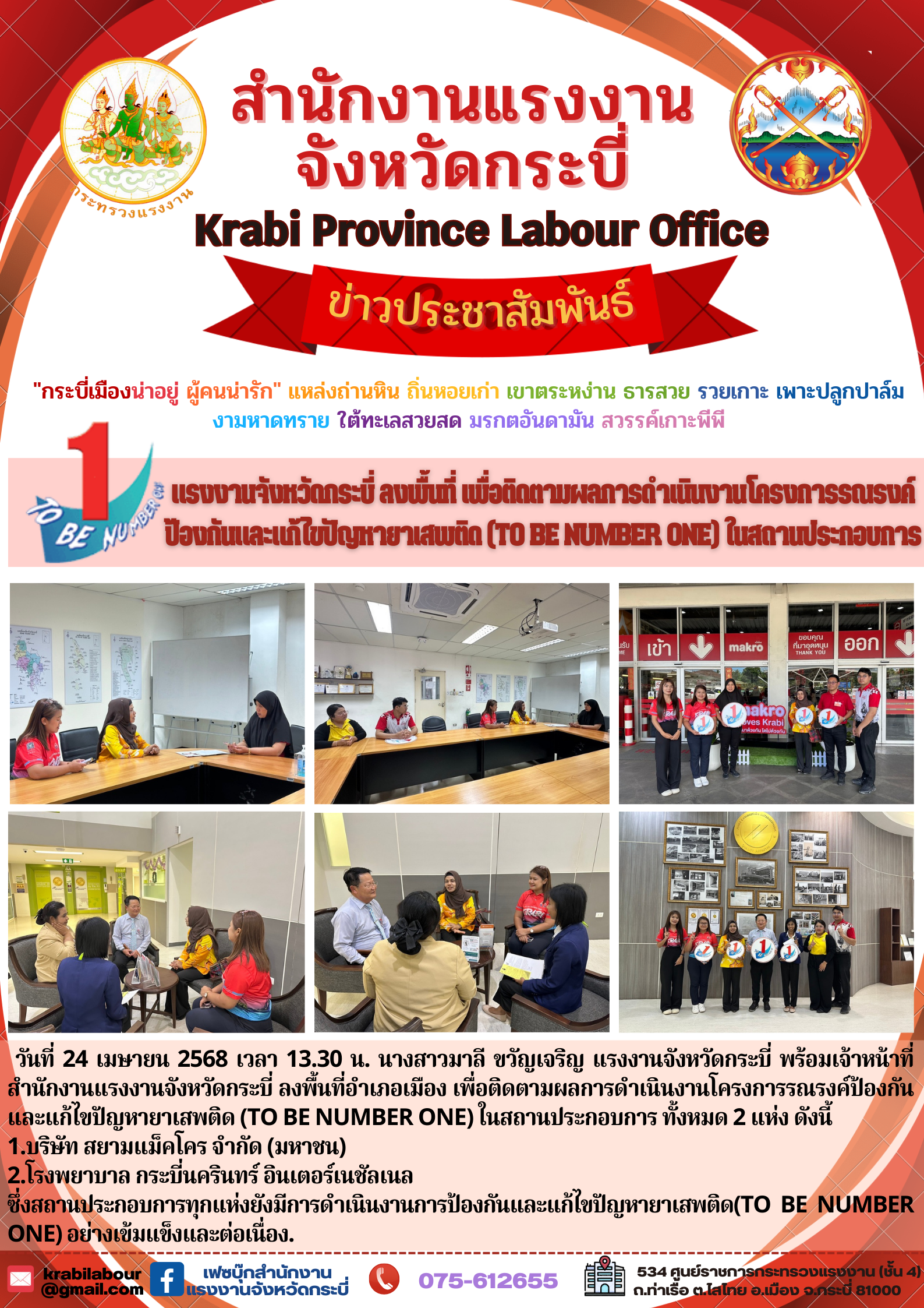 แรงงานจังหวัดกระบี่ ลงพื้นที่ เพื่อติดตามผลการดำเนินงานโครงการรณรงค์ป้องกันและแก้ไขปัญหายาเสพติด (TO BE NUMBER ONE) ในสถานประกอบการ