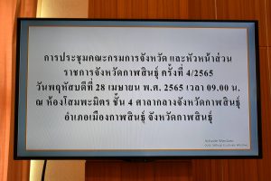 วันพฤหัสบดีที่ 28 เมษายน พ.ศ. 2565 เวลา 09.00 น. นางพนิดา เสถียรจิตร แรงงานจังหวัดกาฬสินธุ์ พร้อมด้วยส่วนราชการสังกัดกระทรวงแรงงานจังหวัดกาฬสินธุ์ ร่วมการประชุมคณะกรมการจังหวัด และหัวหน้าส่วนราชการจังหวัดกาฬสินธุ์ ครั้งที่ 4/2565 ประจำเดือนเมษายน 2565 โดยมีนายทรงพล ใจกริ่ม ผู้ว่าราชการจังหวัดกาฬสินธุ์ เป็นประธาน ณ ห้องประชุมโสมพะมิตร ชั้น 4 ศาลากลางจังหวัดกาฬสินธุ์ อำเภอเมืองกาฬสินธุ์ จังหวัดกาฬสินธุ์