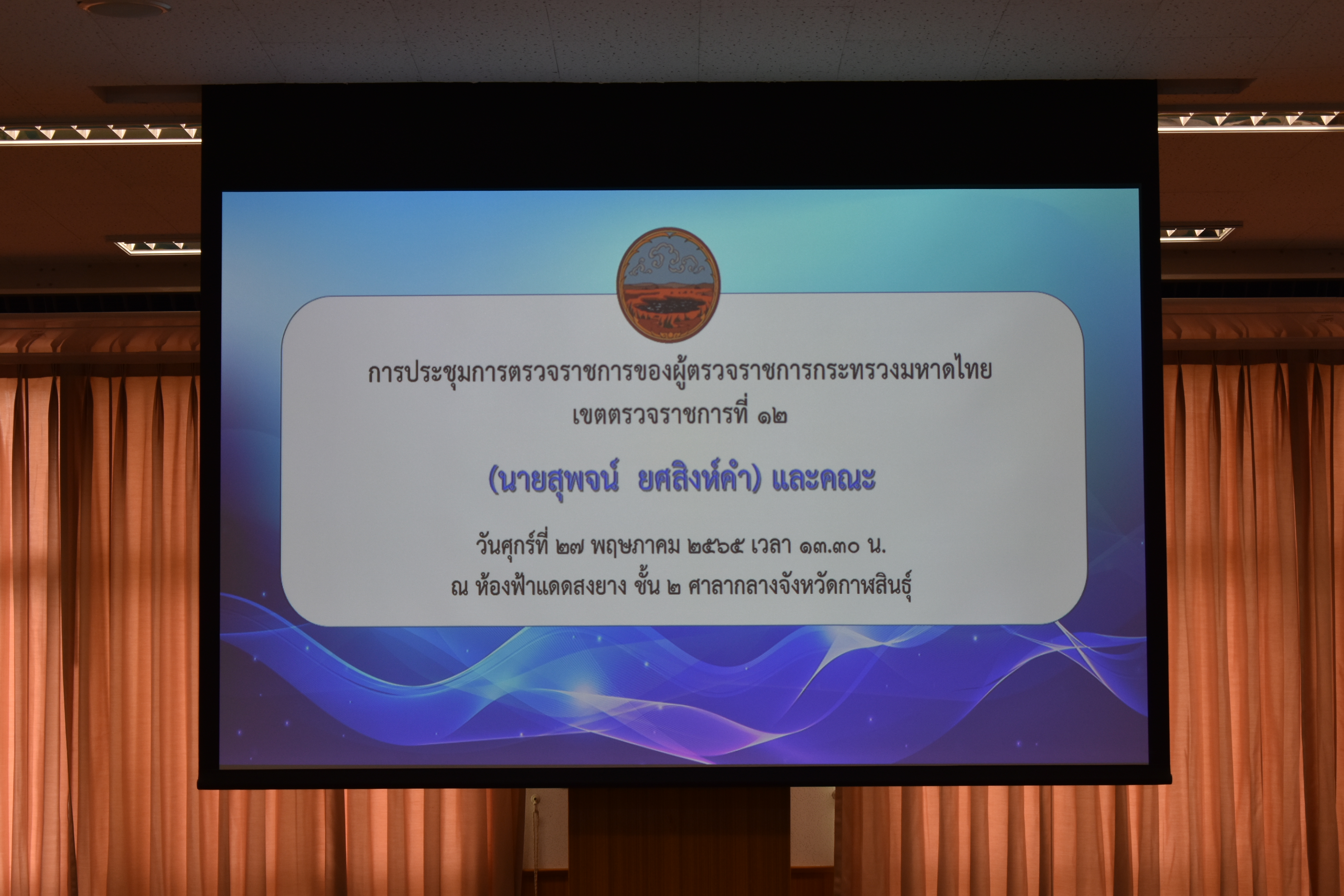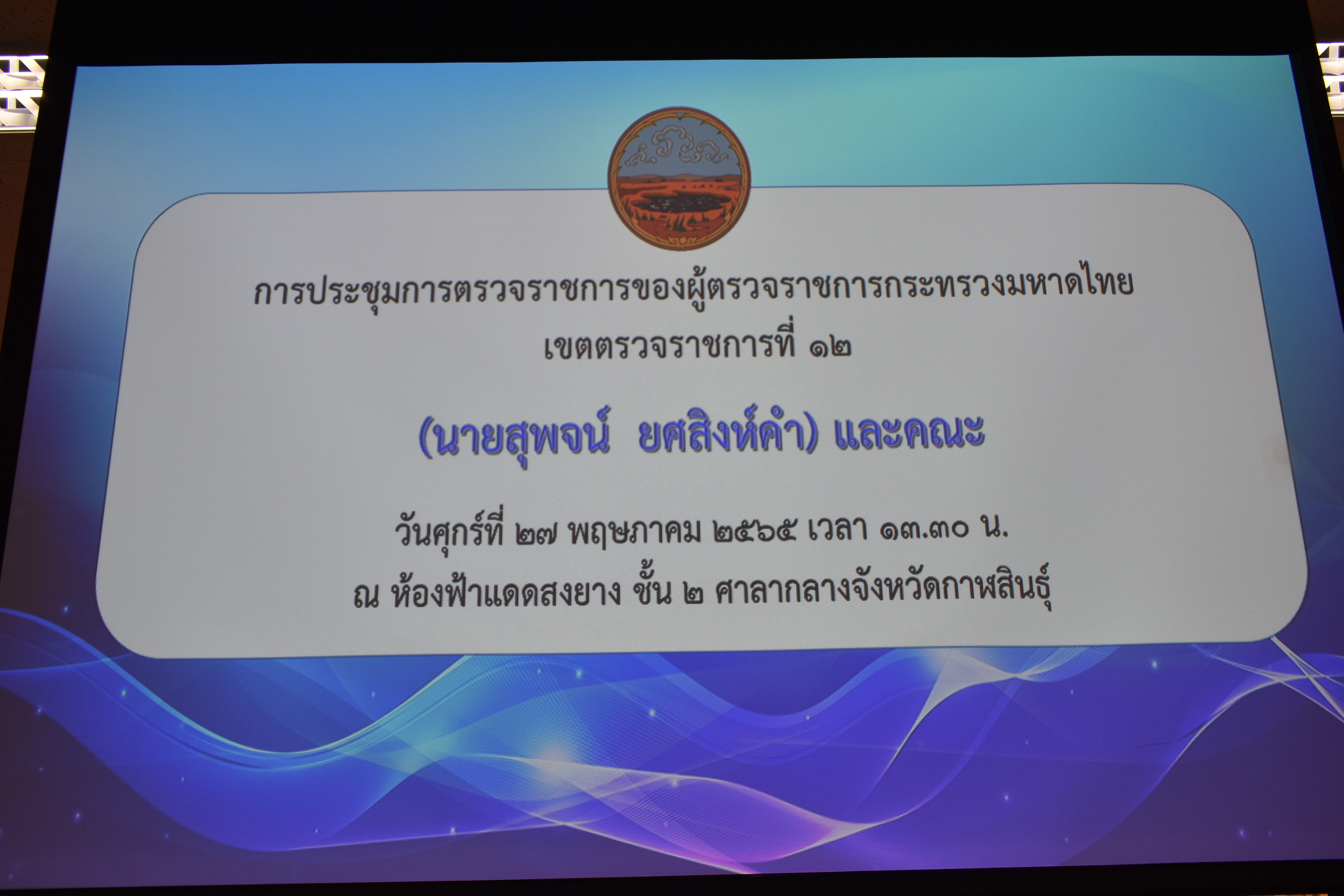 วันศุกร์ที่ 27 พฤษภาคม พ.ศ. 2565 เวลา 13.30 น. จังหวัดกาฬสินธุ์ นายธวัชชัย รอดงาม รองผู้ว่าราชการจังหวัดกาฬสินธุ์ กล่าวรายงาน การประชุมการตรวจราชการของผู้ตรวจราชการกระทรวงมหาดไทย และคณะ เขตตรวจราชการที่ 12 โดยมีนายสุพจน์ ยศสิงห์คำ ผู้ตรวจราชการกระทรวงมหาดไทย เป็นประธานการประชุม