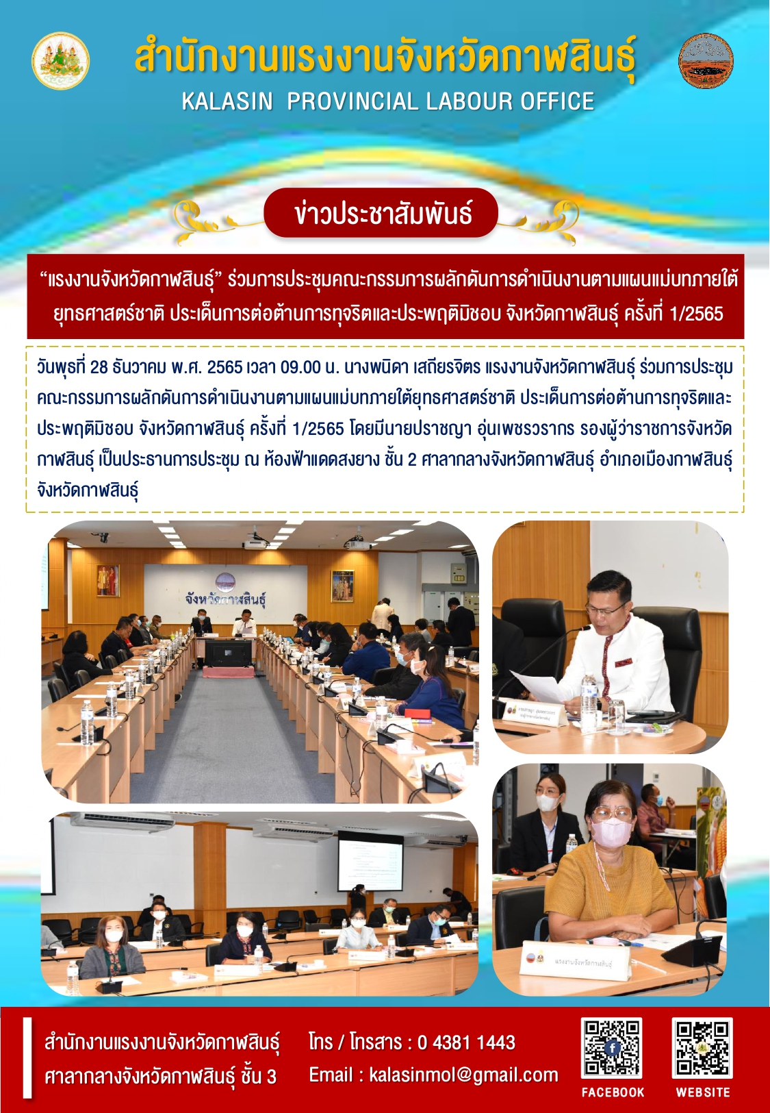 วันพุธที่ 28 ธันวาคม พ.ศ. 2565 เวลา 09.00 น. นางพนิดา เสถียรจิตร แรงงานจังหวัดกาฬสินธุ์ ร่วมการประชุมคณะกรรมการผลักดันการดำเนินงานตามแผนแม่บทภายใต้ยุทธศาสตร์ชาติ ประเด็นการต่อต้านการทุจริตและประพฤติมิชอบ จังหวัดกาฬสินธุ์ ครั้งที่ 1/2565 โดยมีนายปราชญา อุ่นเพชรวรากร รองผู้ว่าราชการจังหวัดกาฬสินธุ์ เป็นประธานการประชุม ณ ห้องฟ้าแดดสงยาง ชั้น 2 ศาลากลางจังหวัดกาฬสินธุ์ อำเภอเมืองกาฬสินธุ์ จังหวัดกาฬสินธุ์