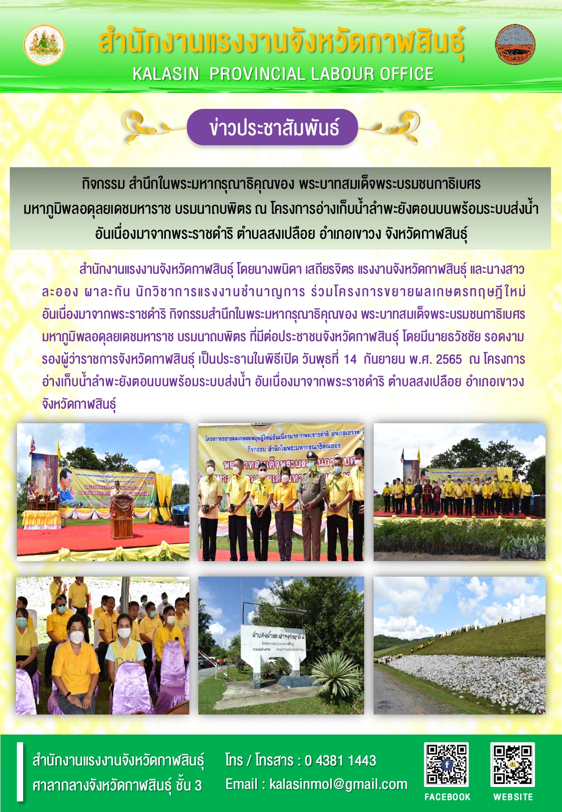 วันพุธที่ 14 กันยายน พ.ศ. 2565 สำนักงานแรงงานจังหวัดกาฬสินธุ์ โดยนางพนิดา เสถียรจิตร แรงงานจังหวัดกาฬสินธุ์ และนางสาวละออง ผาละกัน นักวิชาการแรงงานชำนาญการ ร่วมโครงการขยายผลเกษตรทฤษฎีใหม่อันเนื่องมาจากพระราชดำริ กิจกรรมสำนึกในพระมหากรุณาธิคุณของ พระบาทสมเด็จพระบรมชนกาธิเบศร มหาภูมิพลอดุลยเดชมหาราช บรมนาถบพิตร ที่มีต่อประชาชนจังหวัดกาฬสินธุ์ โดยมีนายธวัชชัย รอดงาม รองผู้ว่าราชการจังหวัดกาฬสินธุ์ เป็นประธานในพิธีเปิด ณ โครงการอ่างเก็บน้ำลำพะยังตอนบนพร้อมระบบส่งน้ำ อันเนื่องมาจากพระราชดำริ ตำบลสงเปลือย อำเภอเขาวง จังหวัดกาฬสินธุ์