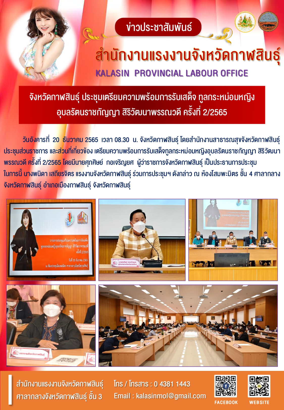 วันอังคารที่ 20 ธันวาคม 2565 เวลา 08.30 น. จังหวัดกาฬสินธุ์ โดยสำนักงานสาธารณสุขจังหวัดกาฬสินธุ์ ประชุมส่วนราชการ และส่วนที่เกี่ยวข้อง เตรียมความพร้อมการรับเสด็จทูลกระหม่อมหญิงอุบลรัตนราชกัญญา สิริวัฒนาพรรณวดี ครั้งที่ 2/2565 โดยมีนายศุภศิษย์ กอเจริญยศ ผู้ว่าราชการจังหวัดกาฬสินธุ์ เป็นประธานการประชุมในการนี้ นางพนิดา เสถียรจิตร แรงงานจังหวัดกาฬสินธุ์ และหัวหน้าส่วนราชการในสังกัด ร่วมการประชุมฯ ดังกล่าว ณ ห้องโสมพะมิตร ชั้น 4 ศาลากลางจังหวัดกาฬสินธุ์ อำเภอเมืองกาฬสินธุ์ จังหวัดกาฬสินธุ์
