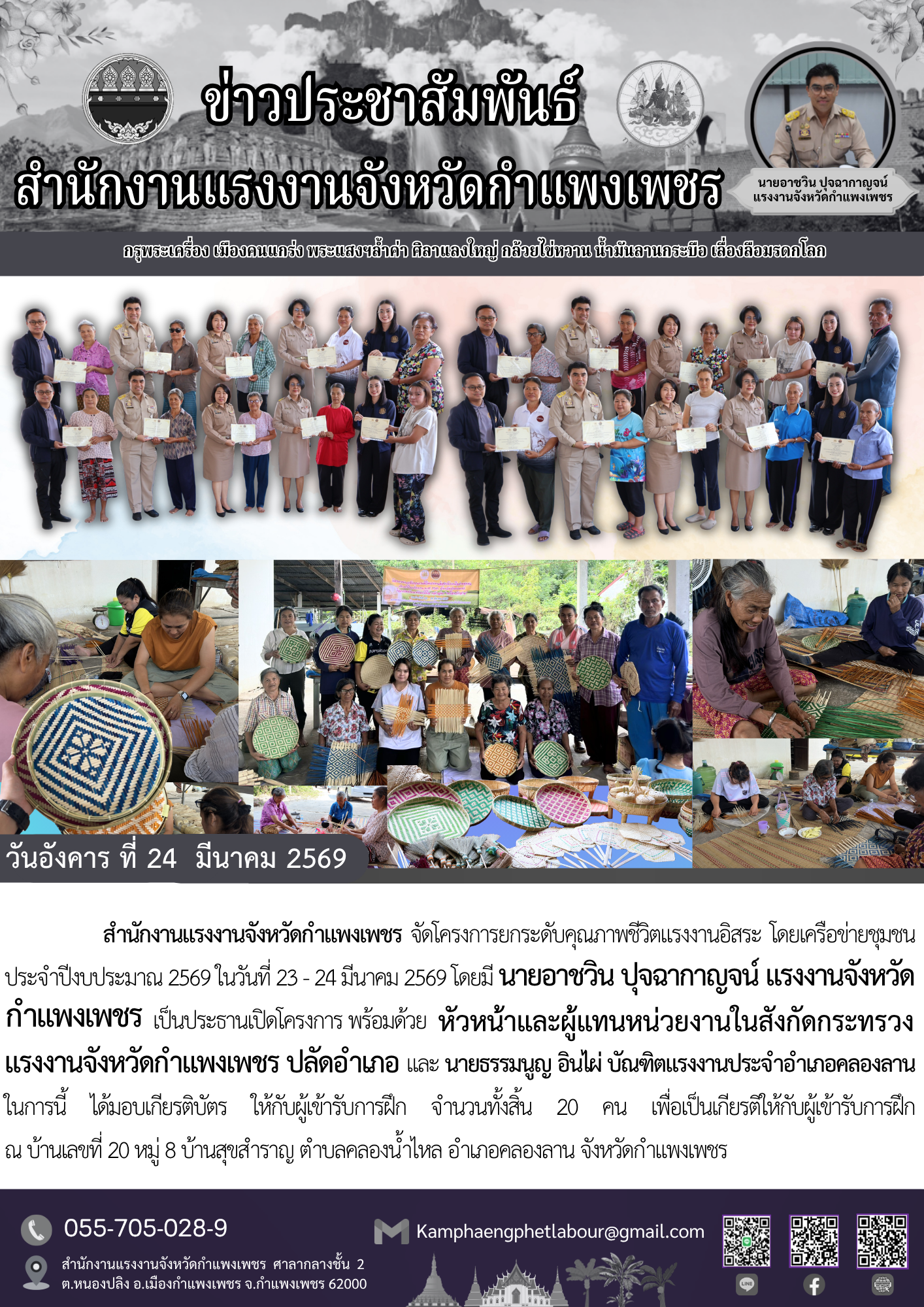 แรงงานจังหวัดกำแพงเพชร มอบเกียรติบัตรให้กับผู้เข้ารับการฝึกอาชีหลักสูตร “เครื่องจักสาน” จำนวนทั้งสิ้น 20 คน