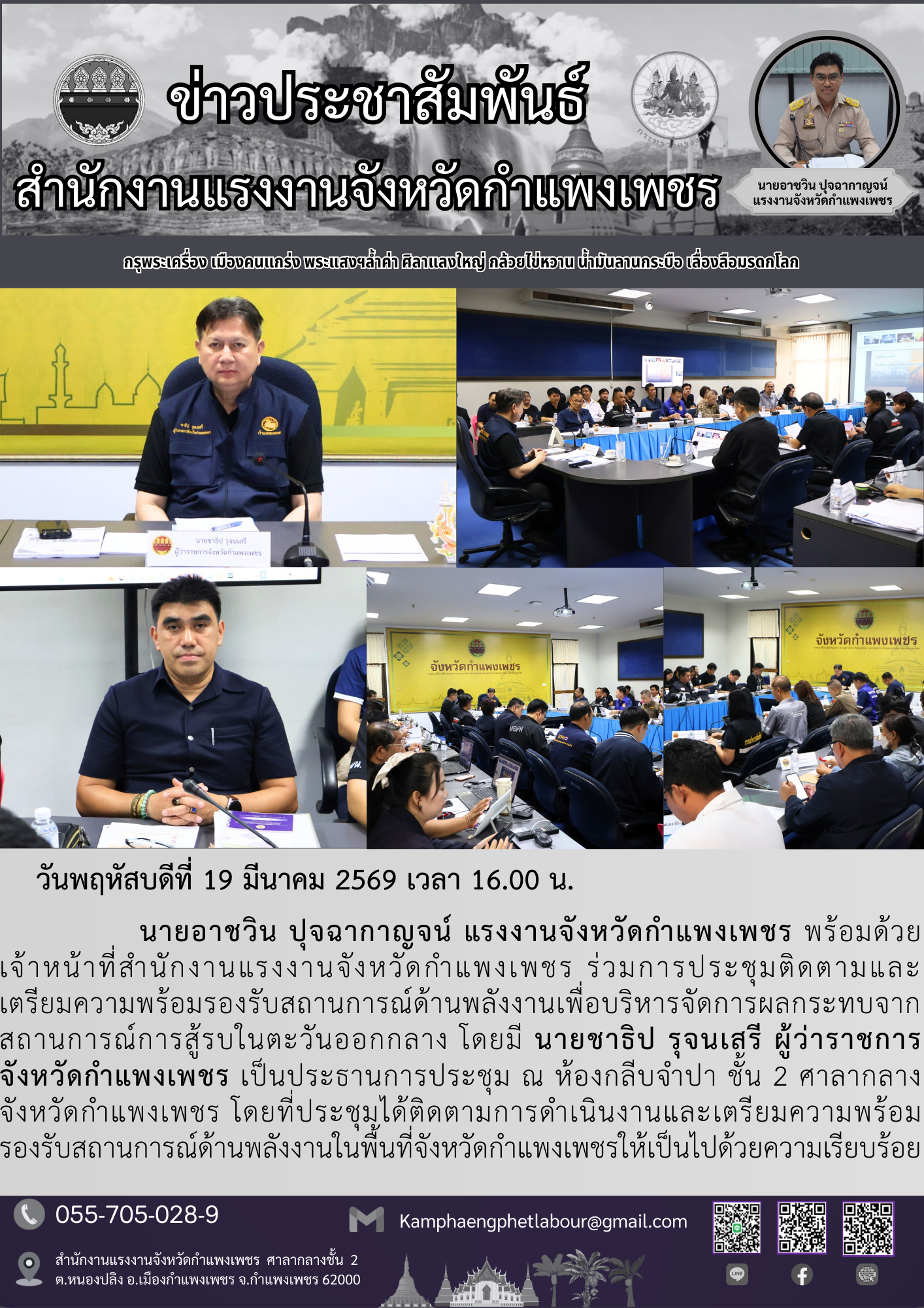 แรงงานจังหวัดกำแพงเพชร ร่วมการประชุมติดตามและเตรียมความพร้อมรองรับสถานการณ์ด้านพลังงาน เพื่อบริหารจัดการผลกระทบจากสถานการณ์การสู้รบในตะวันออกกลาง
