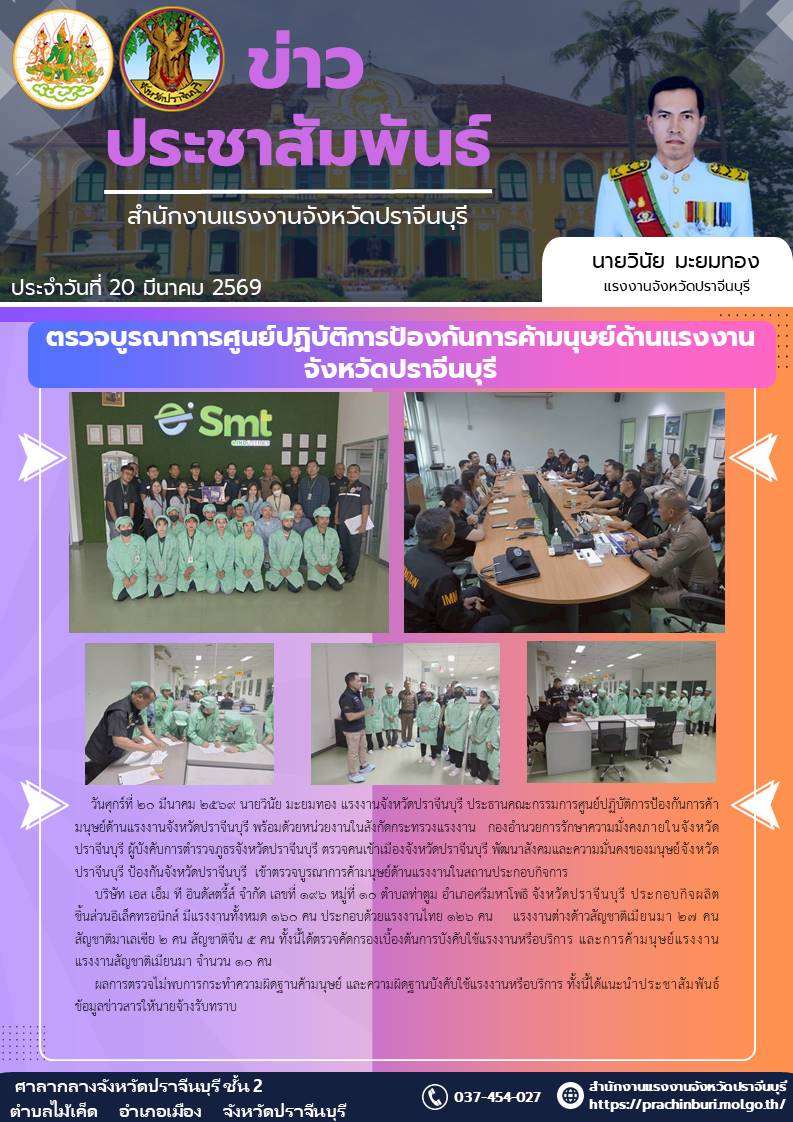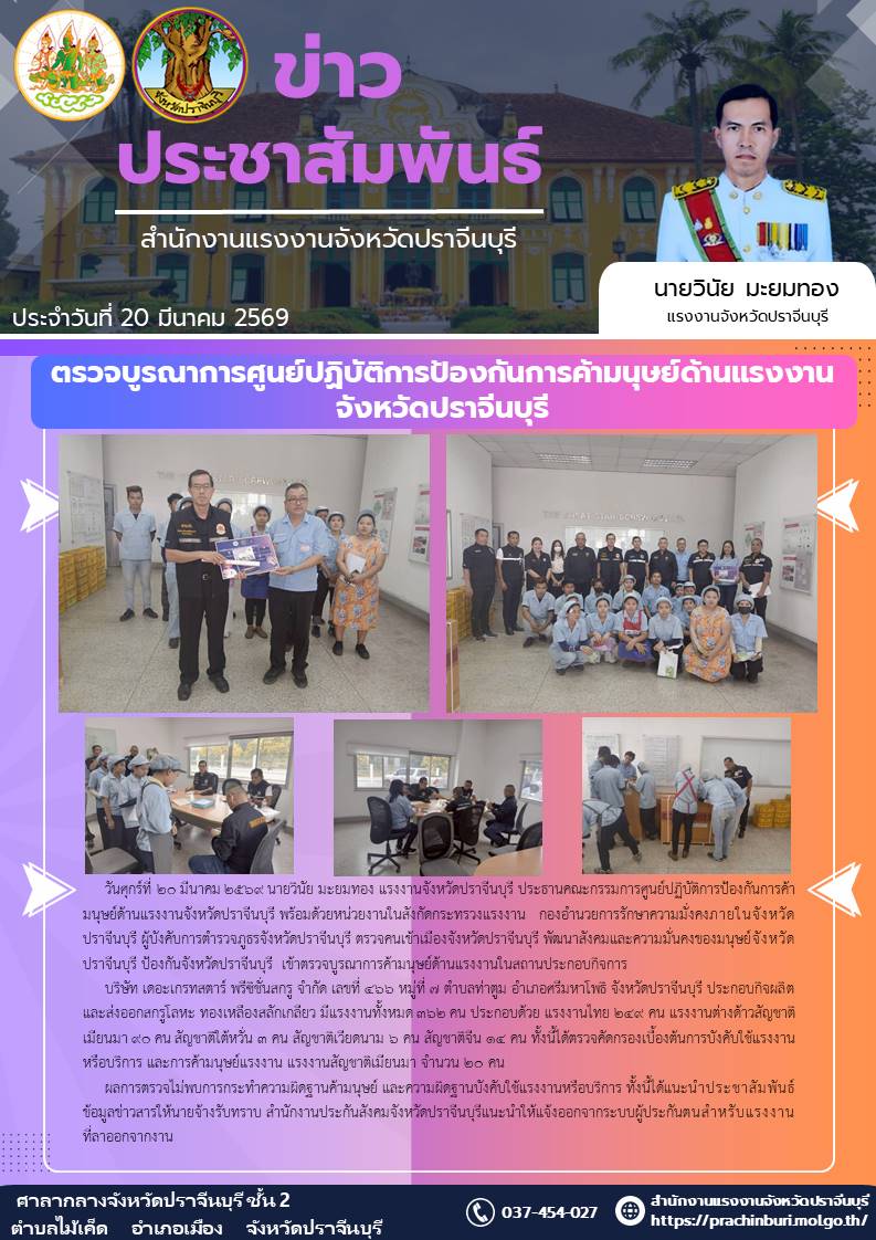 ตรวจบูรณาการศูนย์ปฏิบัติการป้องกันการค้ามนุษย์ด้านแรงงานจังหวัดปราจีนบุรี