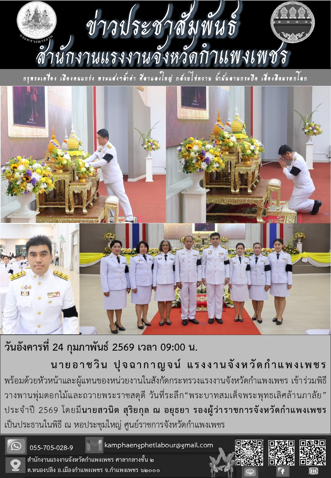 แรงงานจังหวัดกำแพงเพชร ร่วมงานรัฐพิธี “วันที่ระลึกพระบาทสมเด็จพระพุทธเลิศหล้านภาลัย” ประจำปี 2569
