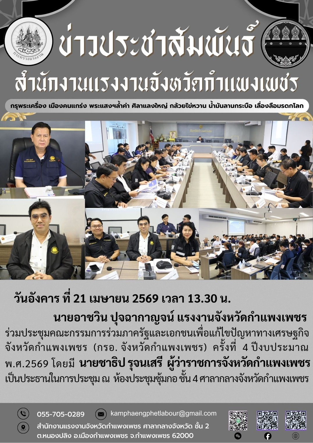 แรงงานจังหวัดกำแพงเพชร ร่วมประชุมคณะกรรมการร่วมภาครัฐและเอกชนเพื่อแก้ไขปัญหาทางเศรษฐกิจ จังหวัดกำแพงเพชร