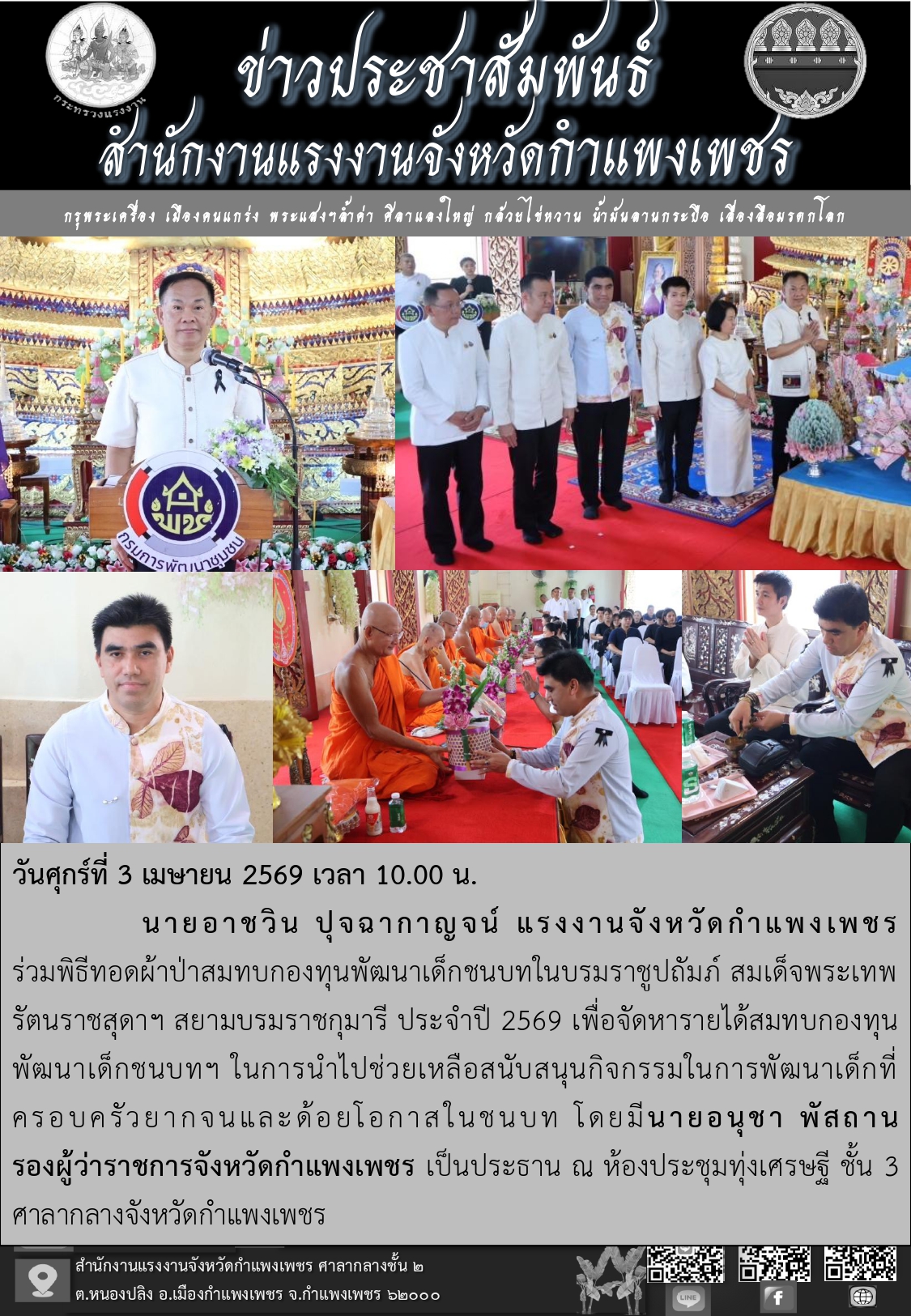 แรงงานจังหวัดกำแพงเพชร ร่วมพิธีทอดผ้าป่าสมทบกองทุนพัฒนาเด็กชนบทในบรมราชูปถัมภ์