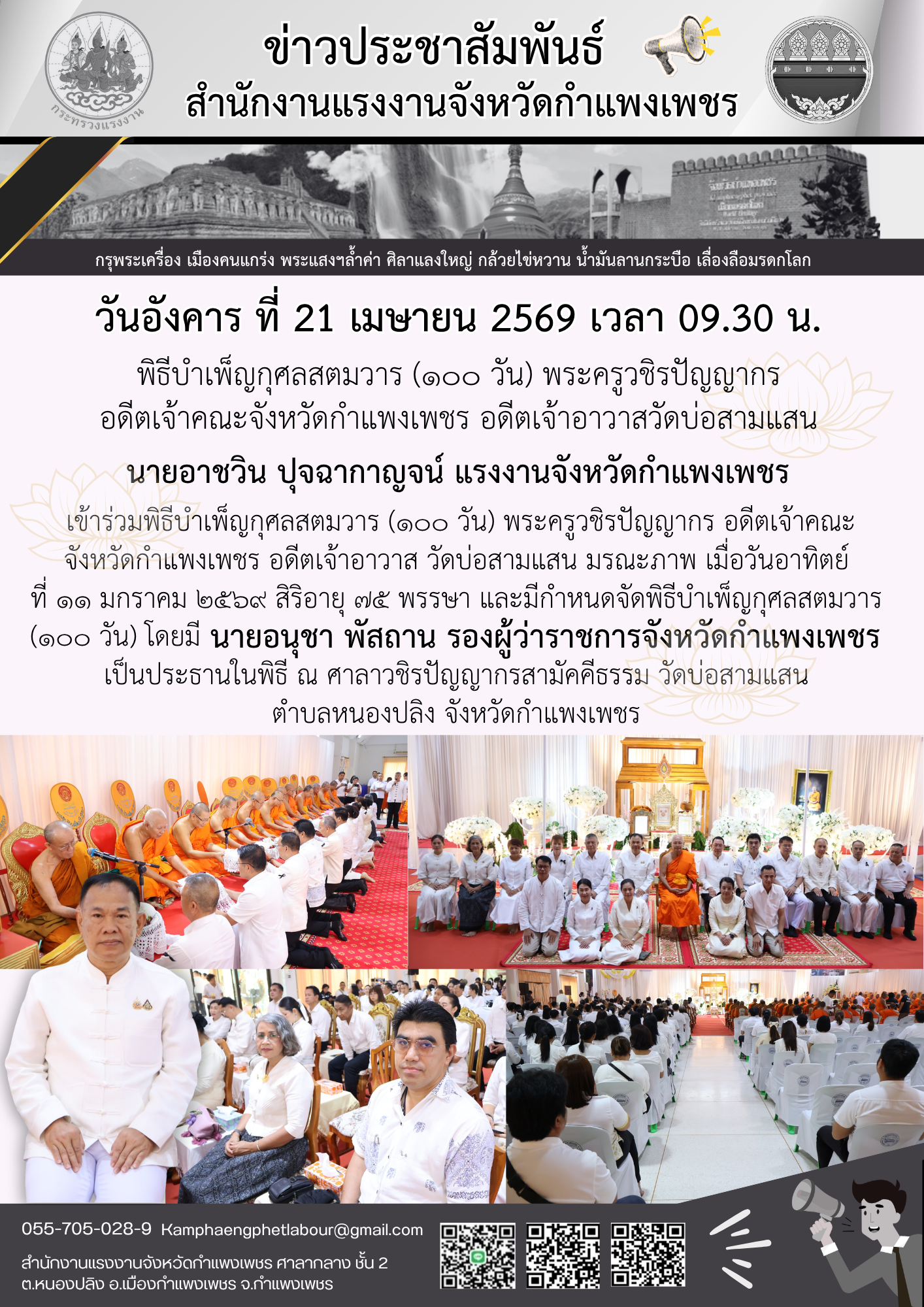 แรงงานจังหวัดกำแพงเพชร ร่วมพิธีบำเพ็ญกุศลสตมวาร (๑๐๐ วัน) พระครูวชิรปัญญากร อดีตเจ้าคณะจังหวัดกำแพงเพชร อดีตเจ้าอาวาสวัดบ่อสามแสน
