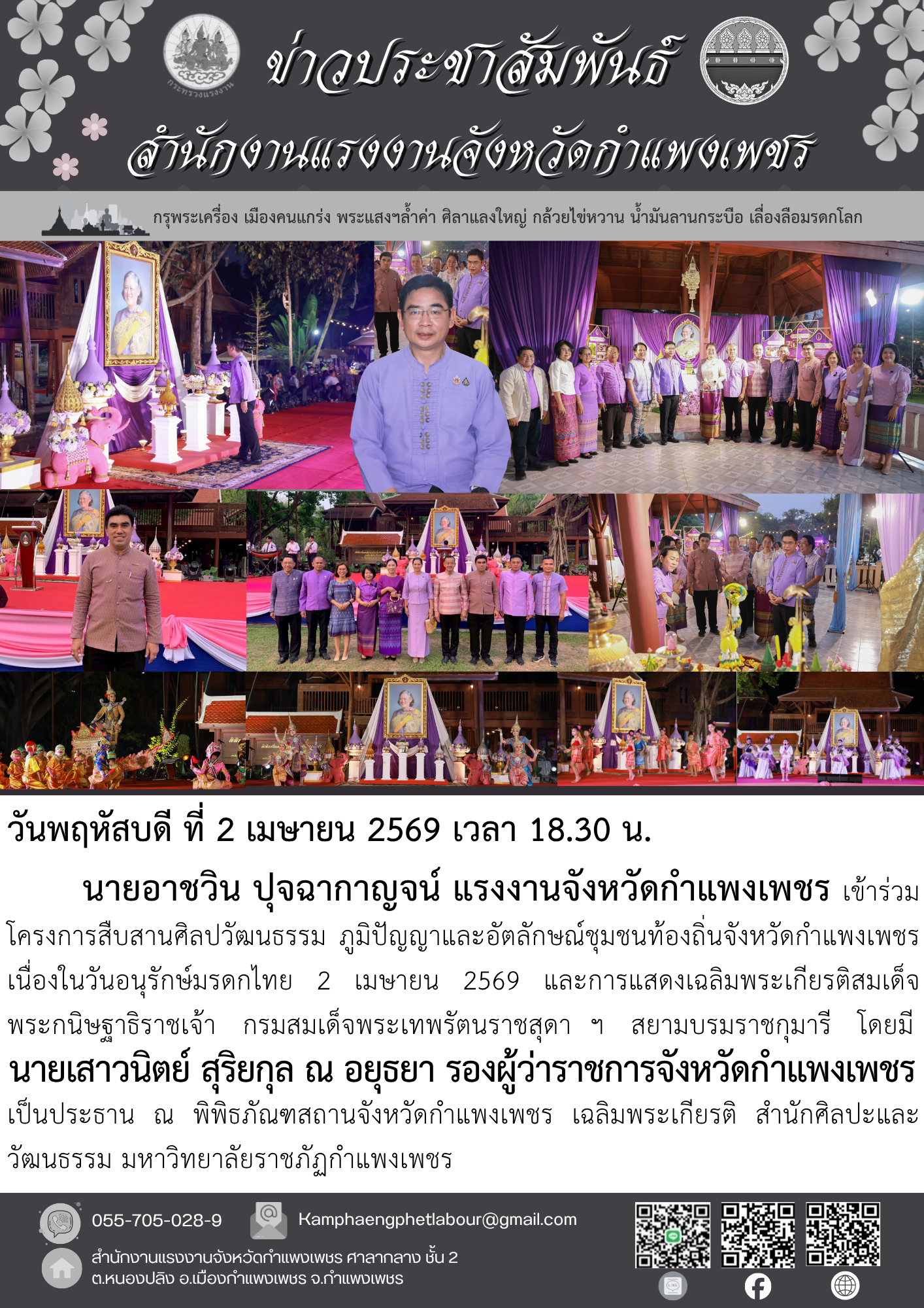 แรงงานจังหวัดกำแพงเพชร ร่วมโครงการสืบสานศิลปวัฒนธรรม ภูมิปัญญาและอัตลักษณ์ชุมชนท้องถิ่นจังหวัดกำแพงเพชร