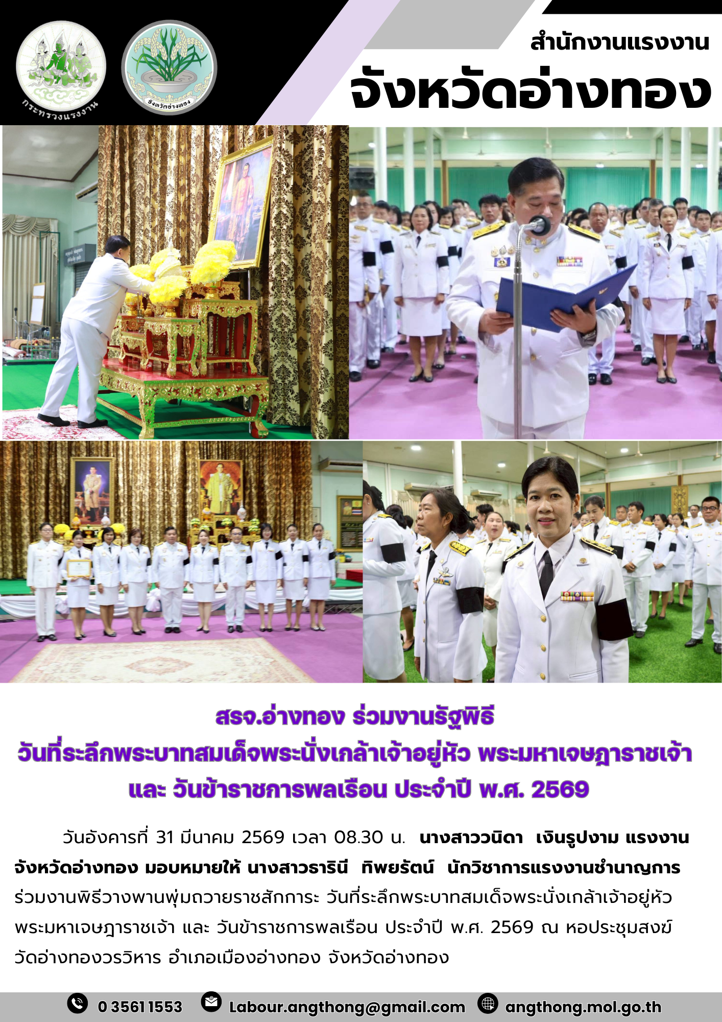 สรจ.อ่างทอง ร่วมงานรัฐพิธี วันที่ระลึกพระบาทสมเด็จพระนั่งเกล้าเจ้าอยู่หัว พระมหาเจษฎาราชเจ้า และ วันข้าราชการพลเรือน ประจำปี พ.ศ. 2569