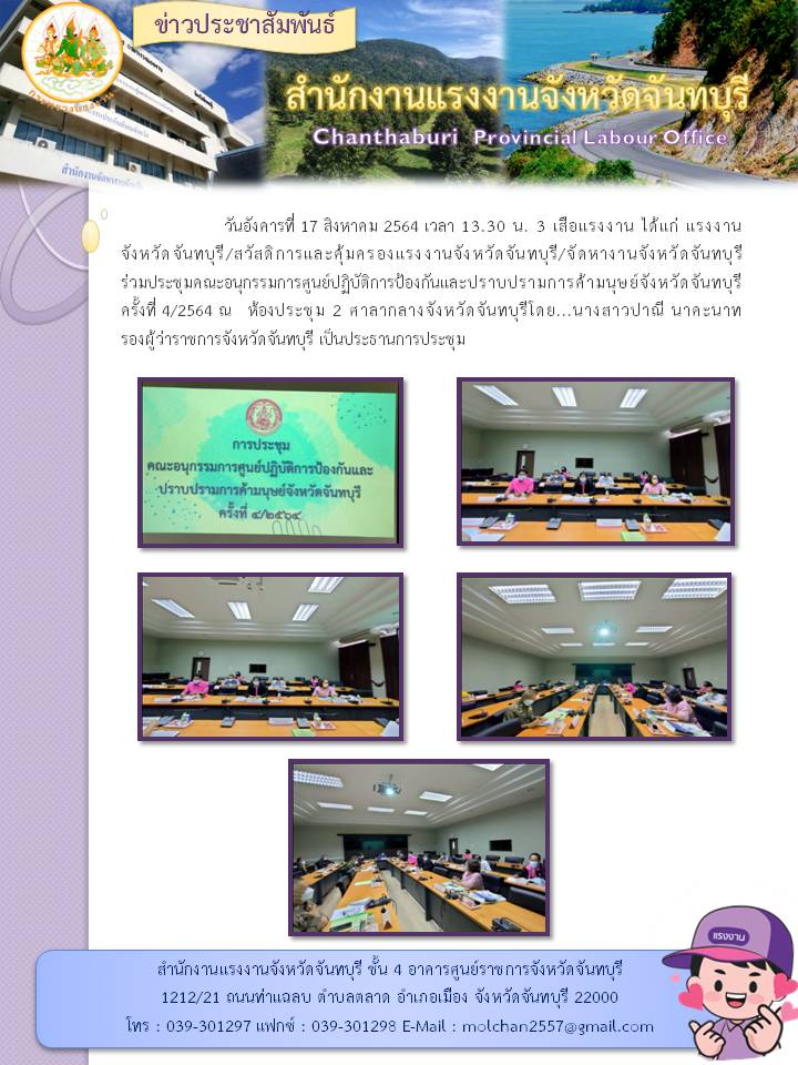 แรงงานจังหวัดจันทบุรีร่วมประชุมคณะอนุกรรมการศูนย์ปฏิบัติการป้องกันและปราบปรามการค้ามนุษย์จังหวัดจันทบุรี ครั้งที่ 4/2564