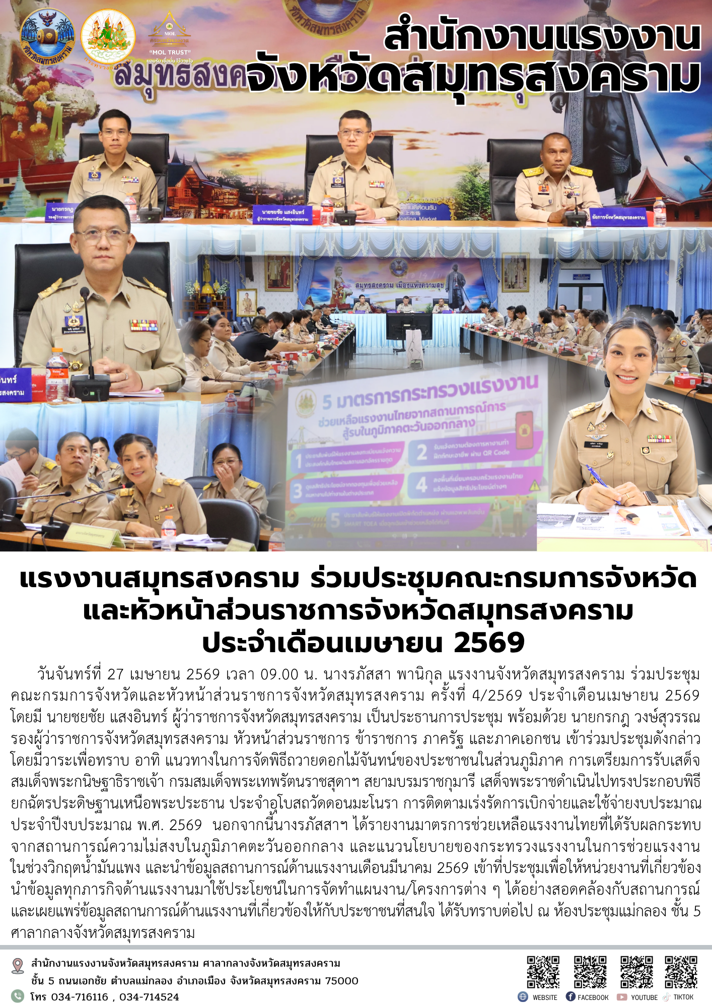 แรงงานสมุทรสงคราม ร่วมประชุมคณะกรมการจังหวัด และหัวหน้าส่วนราชการจังหวัดสมุทรสงคราม ประจำเดือนเมษายน 2569
