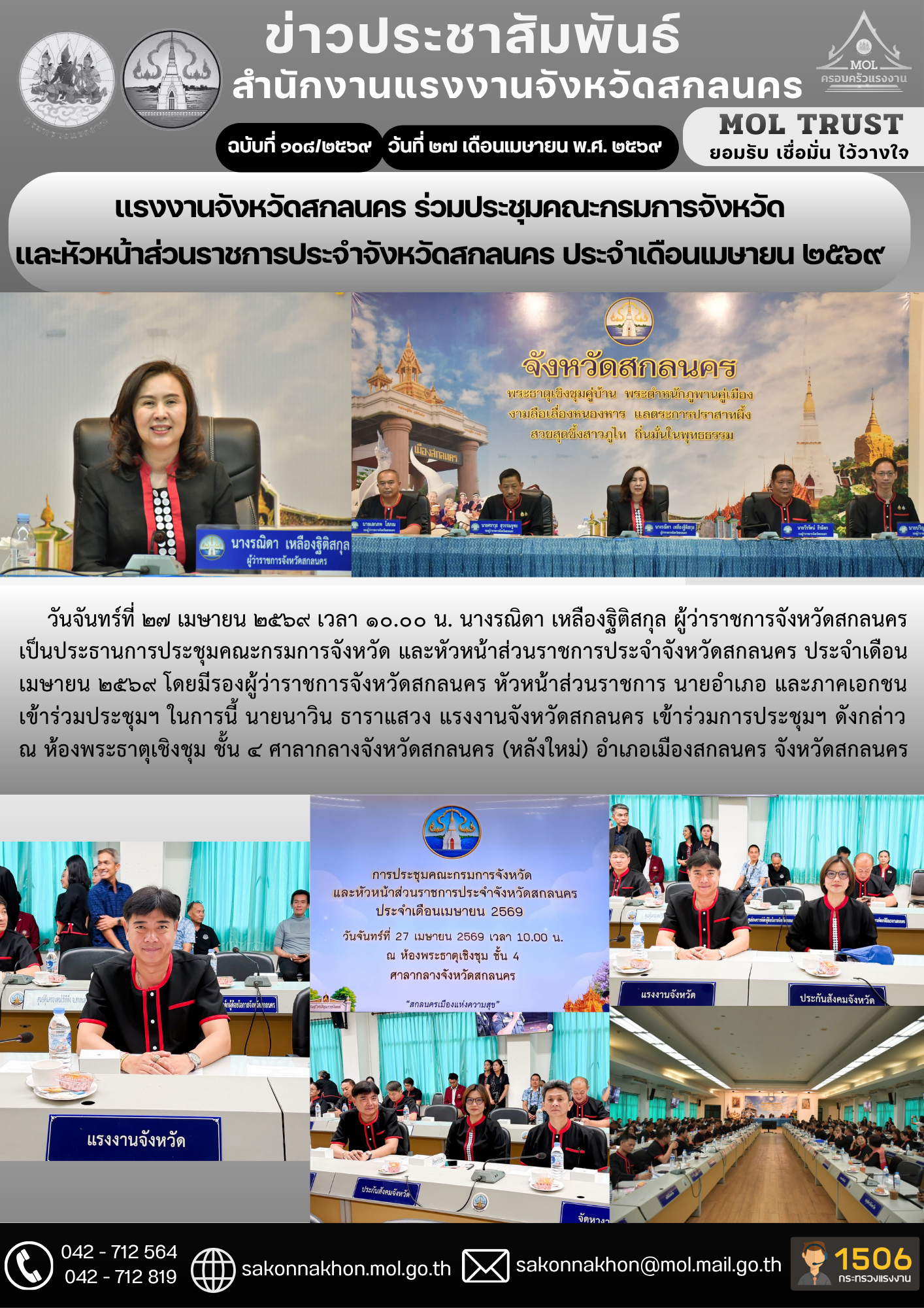 แรงงานจังหวัดสกลนคร ร่วมประชุมคณะกรมการจังหวัด และหัวหน้าส่วนราชการประจำจังหวัดสกลนคร ประจำเดือนเมษายน ๒๕๖๙
