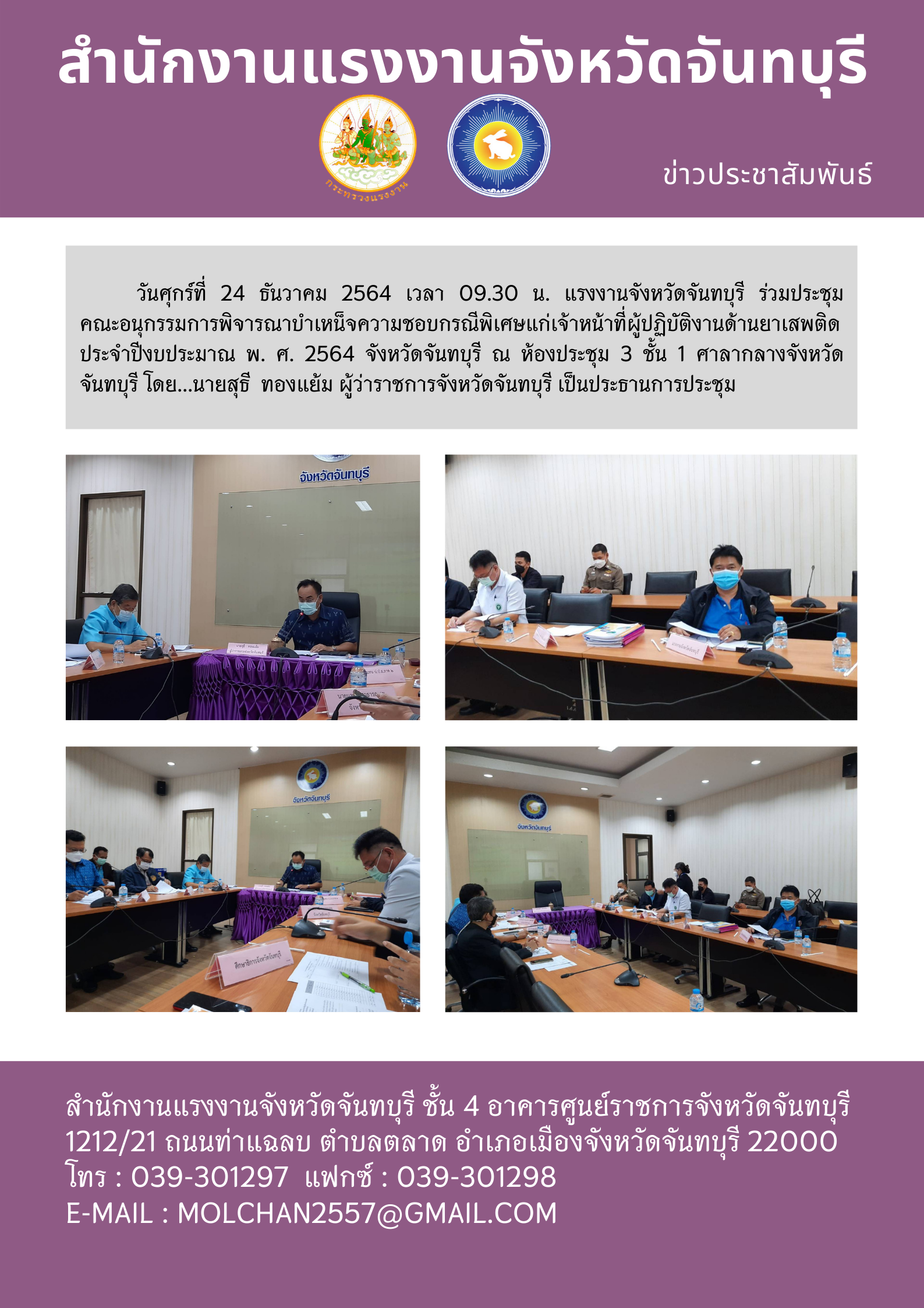 แรงงานจังหวัดจันทบุรี ร่วมประชุมคณะอนุกรรมการพิจารณาบำเหน็จความชอบกรณีพิเศษแก่เจ้าหน้าที่ผู้ปฏิบัติงานด้านยาเสพติด ประจำปีงบประมาณ พ. ศ. 2564