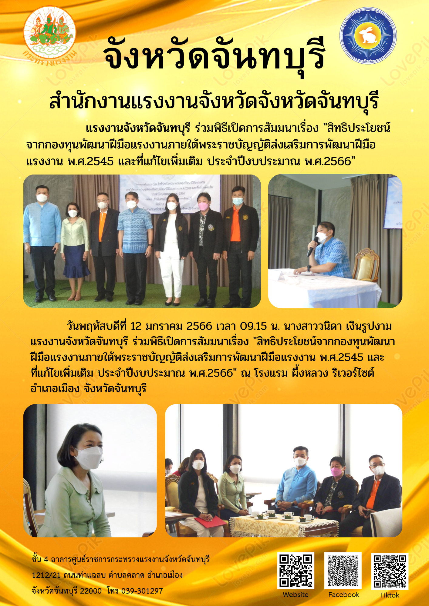 แรงงานจังหวัดจันทบุรี ร่วมพิธีเปิดการสัมมนาเรื่อง “สิทธิประโยชน์จากกองทุนพัฒนาฝีมือแรงงานภายใต้พระราชบัญญัติส่งเสริมการพัฒนาฝีมือแรงงาน พ.ศ.2545 และที่แก้ไขเพิ่มเติม ประจำปีงบประมาณ พ.ศ.2566”