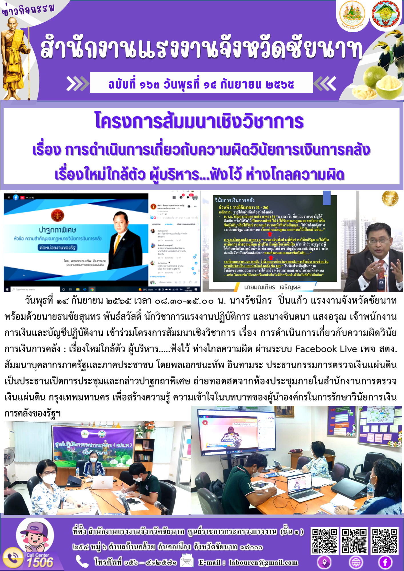 แรงงานจังหวัดชัยนาทเข้าร่วมโครงการสัมมนาเชิงวิชาการ เรื่อง การดำเนินการเกี่ยวกับความผิดวินัยการเงินการคลัง : เรื่องใหม่ใกล้ตัว ผู้บริหาร…..ฟังไว้ ห่างไกลความผิด