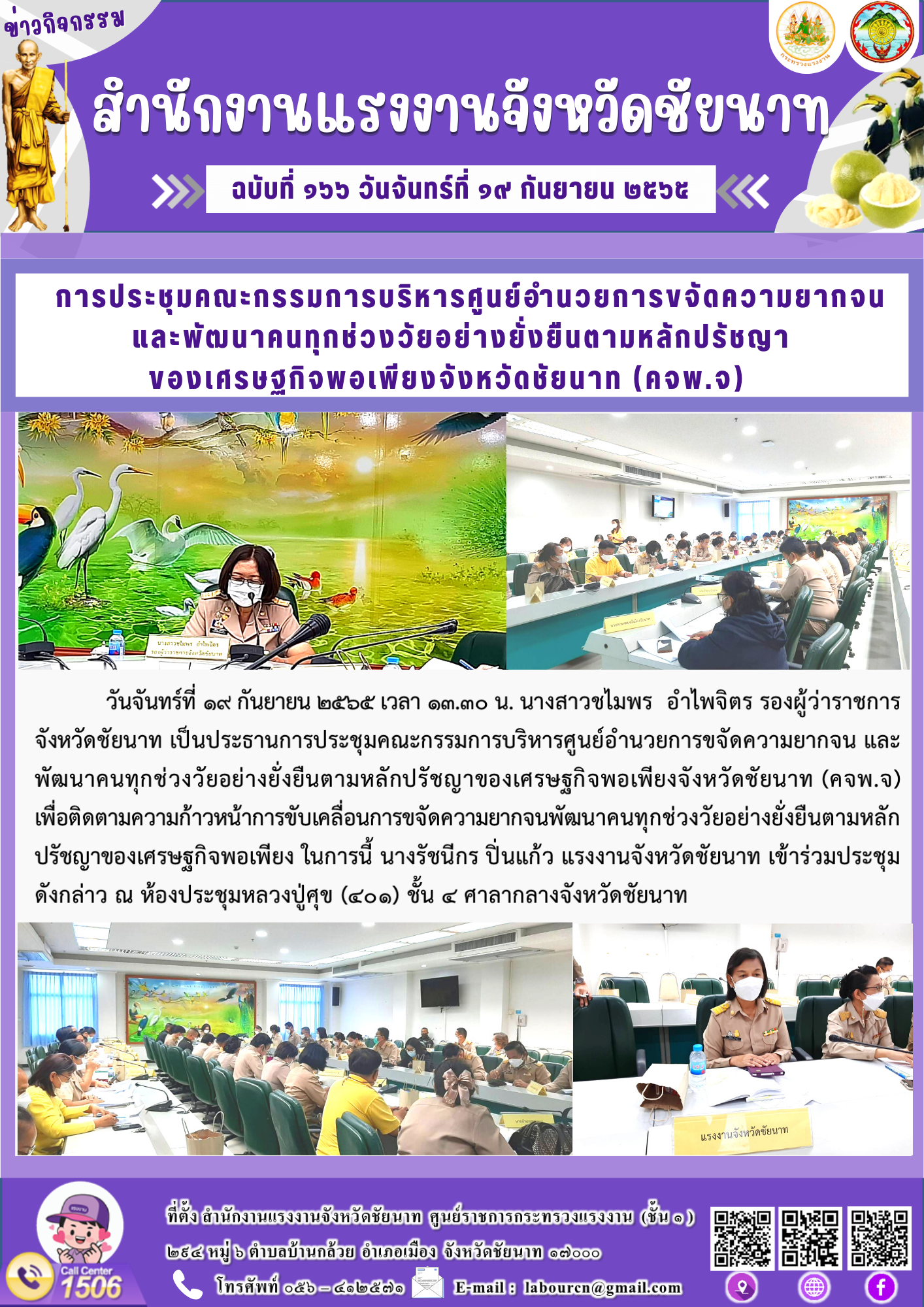 แรงงานจังหวัดชัยนาท ร่วมประชุมคณะกรรมการบริหารศูนย์อำนวยการขจัดความยากจน และพัฒนาคนทุกช่วงวัยอย่างยั่งยืนตามหลักปรัชญาของเศรษฐกิจพอเพียงจังหวัดชัยนาท (คจพ.จ)