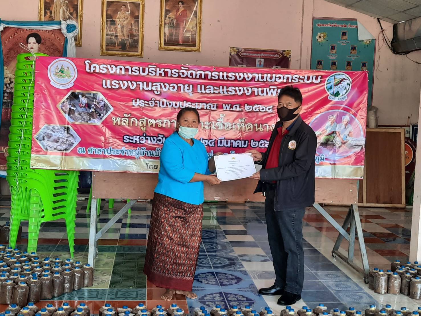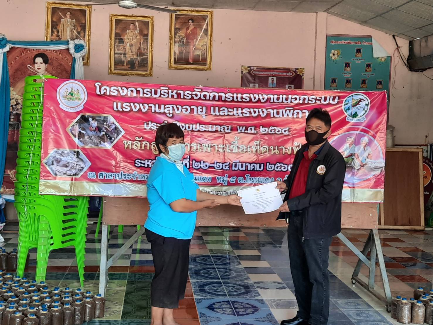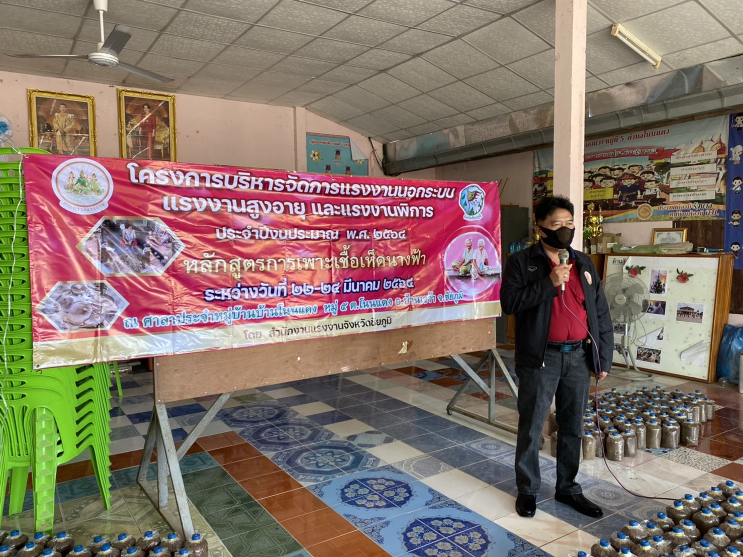 วันพุธที่ 24 มีนาคม 2564 เวลา 10.00 น. นายอำนาจ เชิงไว แรงงานจังหวัดชัยภูมิ เป็นประธานปิดโครงการ และมอบวุฒิบัตรแก่ผู้เข้ารับการ ฝึกอบรม หลักสูตร การเพาะเชื้อเห็ดนางฟ้า จำนวน 20 คน ตามโครงการบริหารจัดการแรงงานนอกระบบ แรงงานสูงอายุ และแรงงานพิการ ณ ศาลาประชาคมบ้านโนนแดง หมู่ที่ 5 ตำบลโนนแดง อำเภอบ้านเขว้า จังหวัดชัยภูมิ