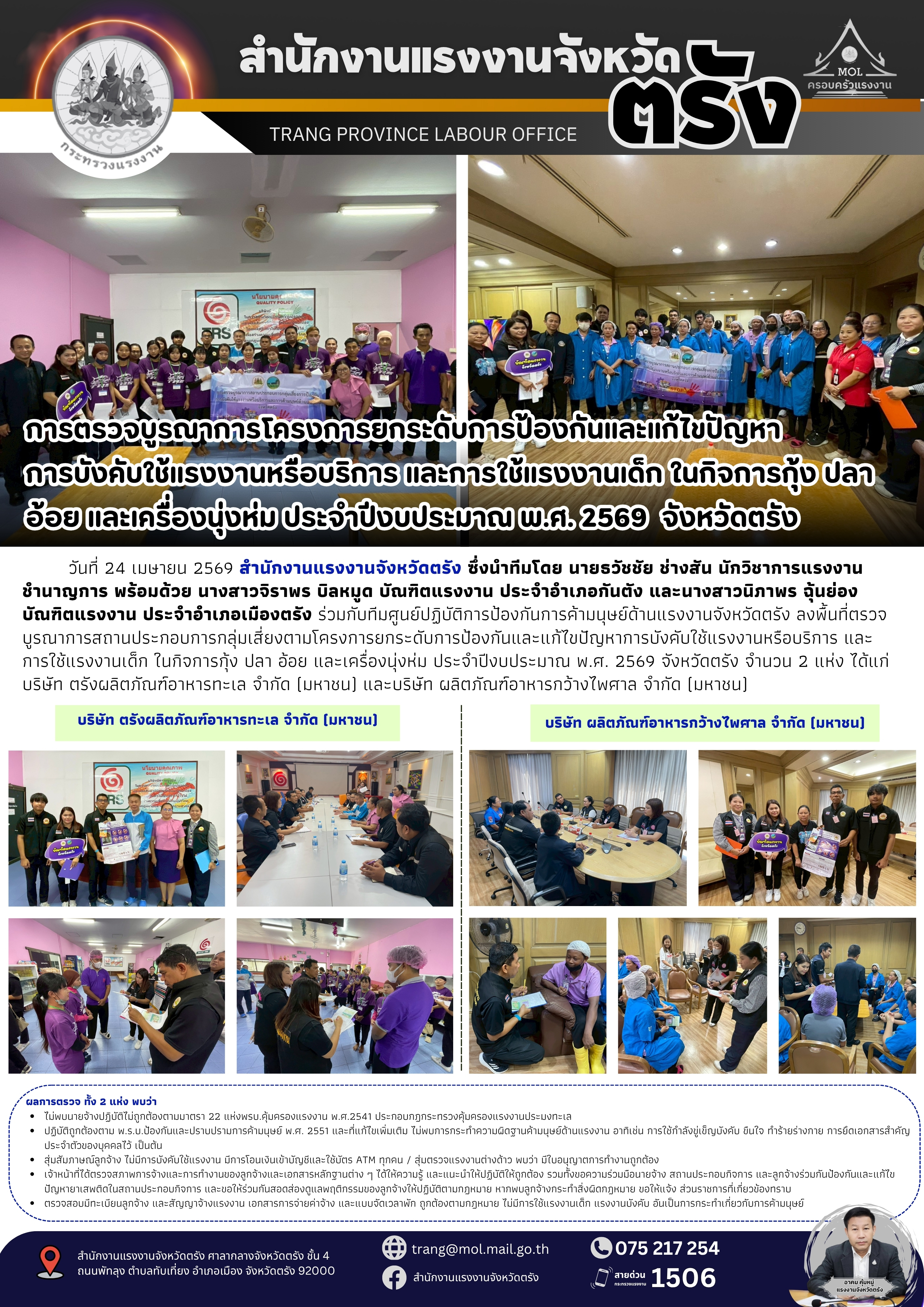 สรจ.ตรัง ลงพื้นที่ตรวจบูรณาการสถานประกอบการกลุ่มเสี่ยงตามโครงการยกระดับการป้องกันและแก้ไขปัญหาการบังคับใช้แรงงานหรือบริการ และการใช้แรงงานเด็ก ในกิจการกุ้ง ปลา อ้อย และเครื่องนุ่งห่ม ประจำปีงบประมาณ พ.ศ. 2569 จังหวัดตรัง