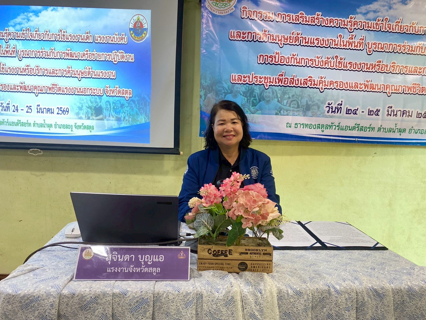 แรงงานสตูล จัดกิจกรรมการเสริมสร้างความรู้ความเข้าใจเกี่ยวกับการใช้แรงงานเด็ก แรงงานบังคับ และการค้ามนุษย์ด้านแรงงานในพื้นที่บูรณาการร่วมกับการพัฒนาเครือข่ายการปฏิบัติงาน การป้องกันการบังคับใช้แรงงานหรือบริการและการค้ามนุษย์ด้านแรงงาน และประชุมเพื่อส่งเสริมคุ้มครองและพัฒนาคุณภาพชีวิตแรงงานนอกระบบ จังหวัดสตูล