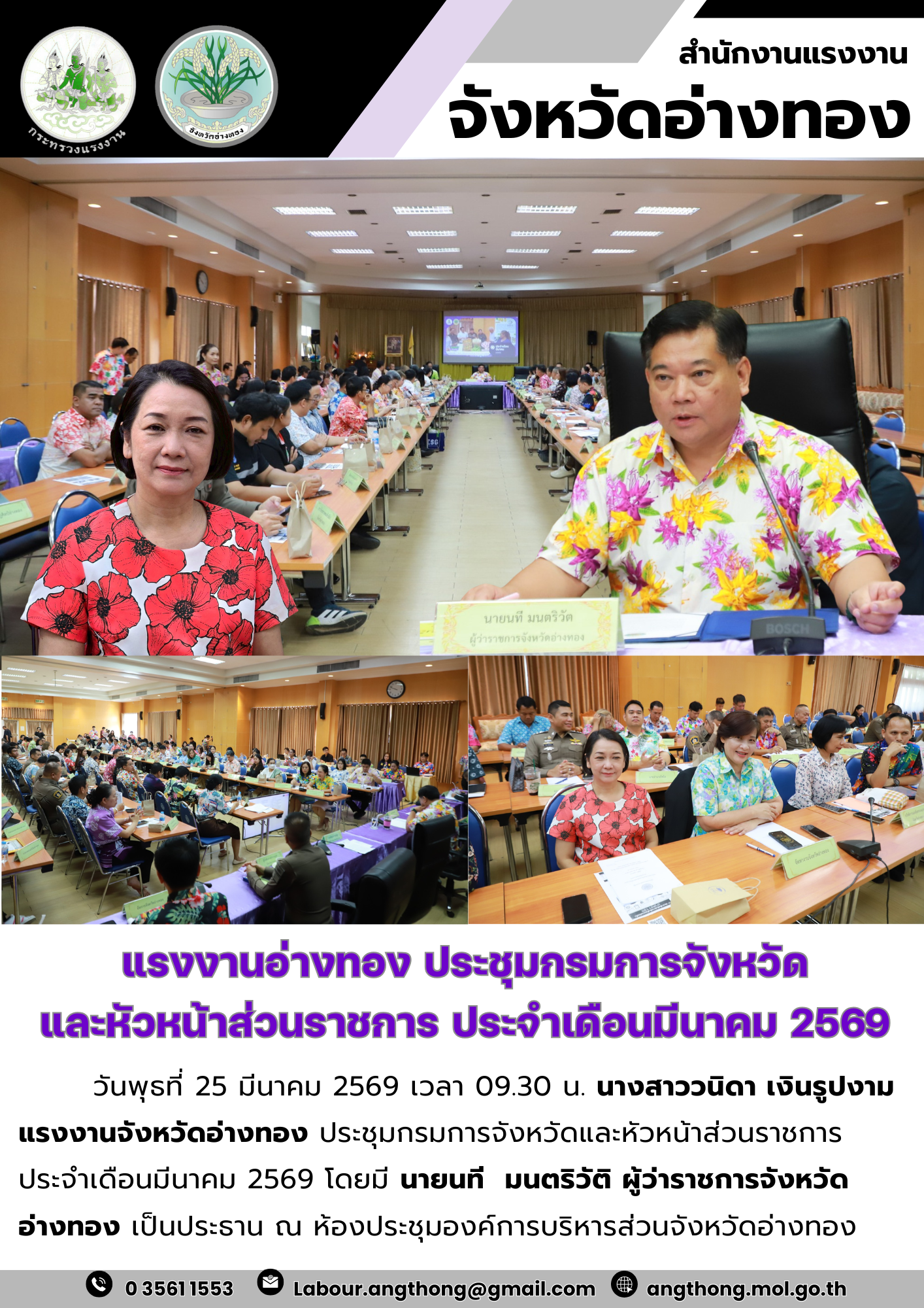 แรงงานอ่างทอง ประชุมกรมการจังหวัด และหัวหน้าส่วนราชการ ประจำเดือนมีนาคม 2569