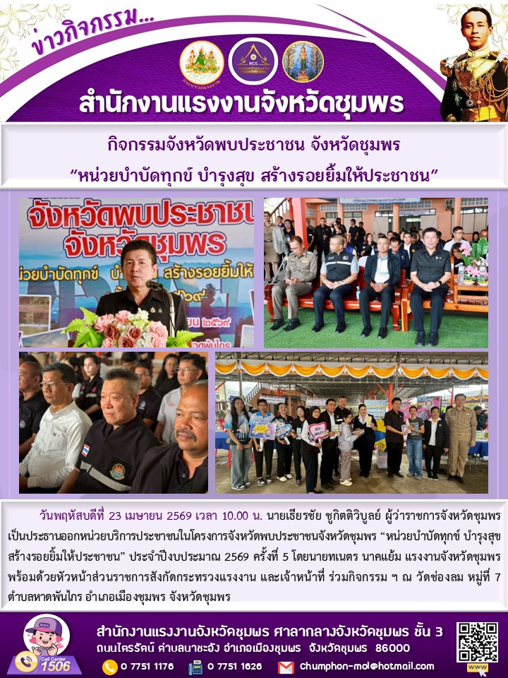 แรงงานจังหวัดชุมพร พร้อมด้วยหัวส่วนราชการสังกัดกระทรวงแรงงานจังหวัดชุมพร และเจ้าหน้าที่ ร่วมกิจกรรมกิจกรรมจังหวัดพบประชาชน จังหวัดชุมพร หน่วยบำบัดทุกข์ บำรุงสุข สร้างรอยยิ้มให้ประชาชน ประจำปีงบประมาณ 2569 ครั้งที่ 5