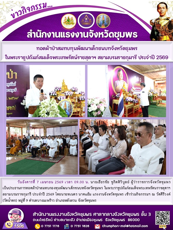 แรงงานจังหวัดชุมพร ร่วมกิจกรรมทอดผ้าป่าสมทบทุนพัฒนาเด็กชนบทจังหวัดชุมพร ในพระราชูปถัมภ์สมเด็จพระเทพรัตน์ราชสุดาฯ สยามบรมราชกุมารี ประจำปี 2569
