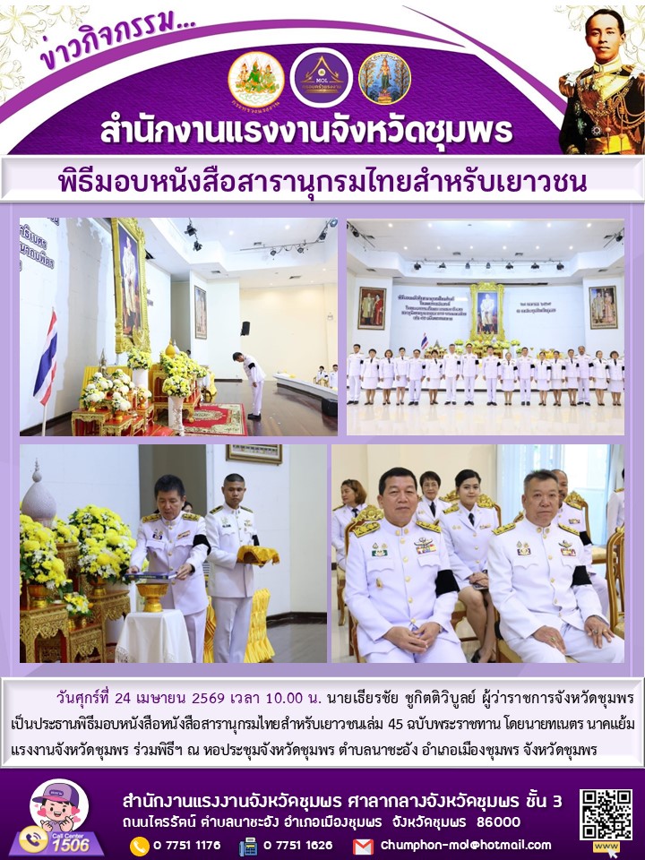 แรงงานจังหวัดชุมพร ร่วมกิจกรรมพิธีมอบหนังสือสารานุกรมไทยสำหรับเยาวชน เล่ม 45 ฉบับพระราชทาน