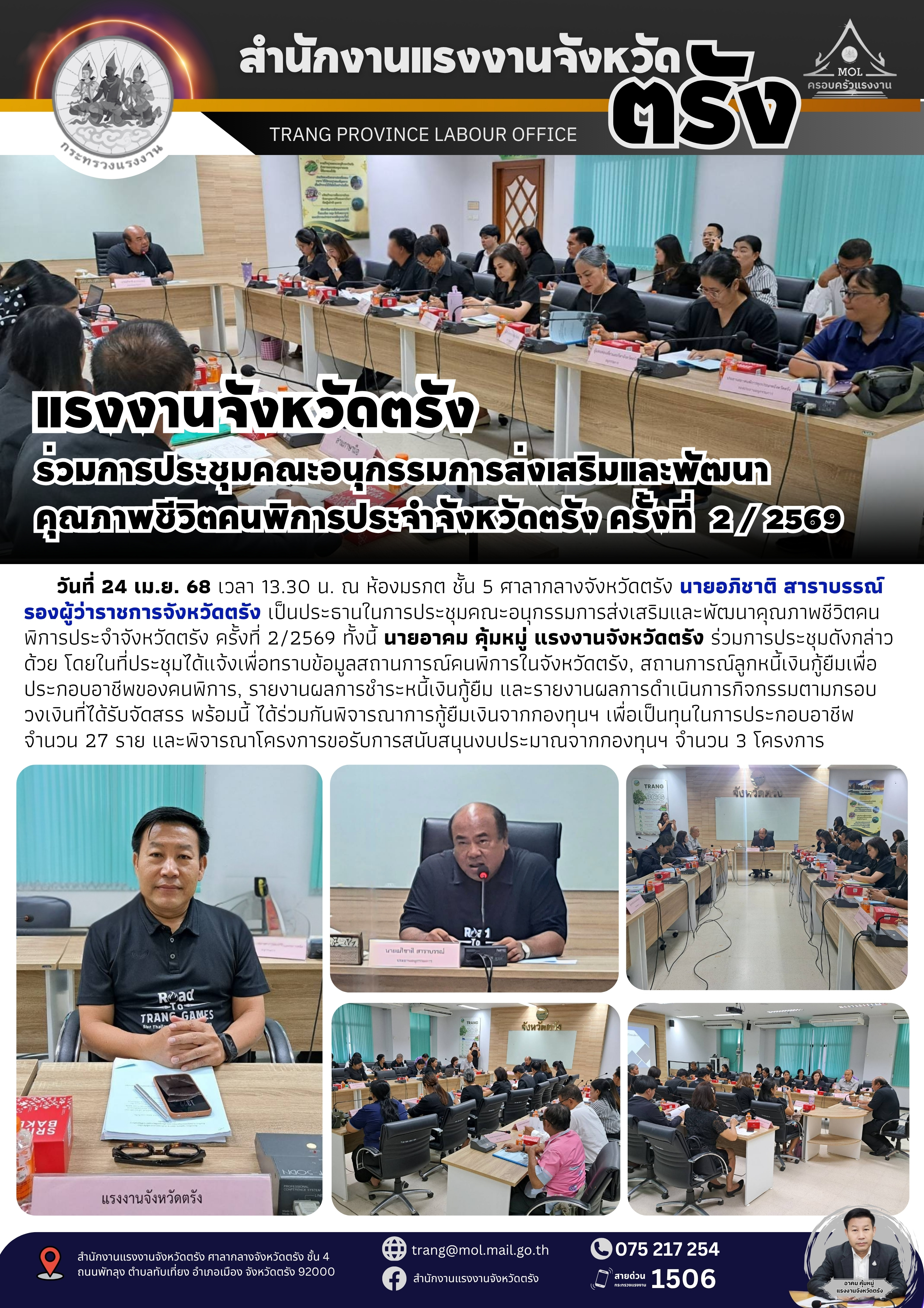 แรงงานจังหวัดตรัง ร่วมการประชุมคณะอนุกรรมการส่งเสริมและพัฒนาคุณภาพชีวิตคนพิการประจำจังหวัดตรัง ครั้งที่ 2/2569