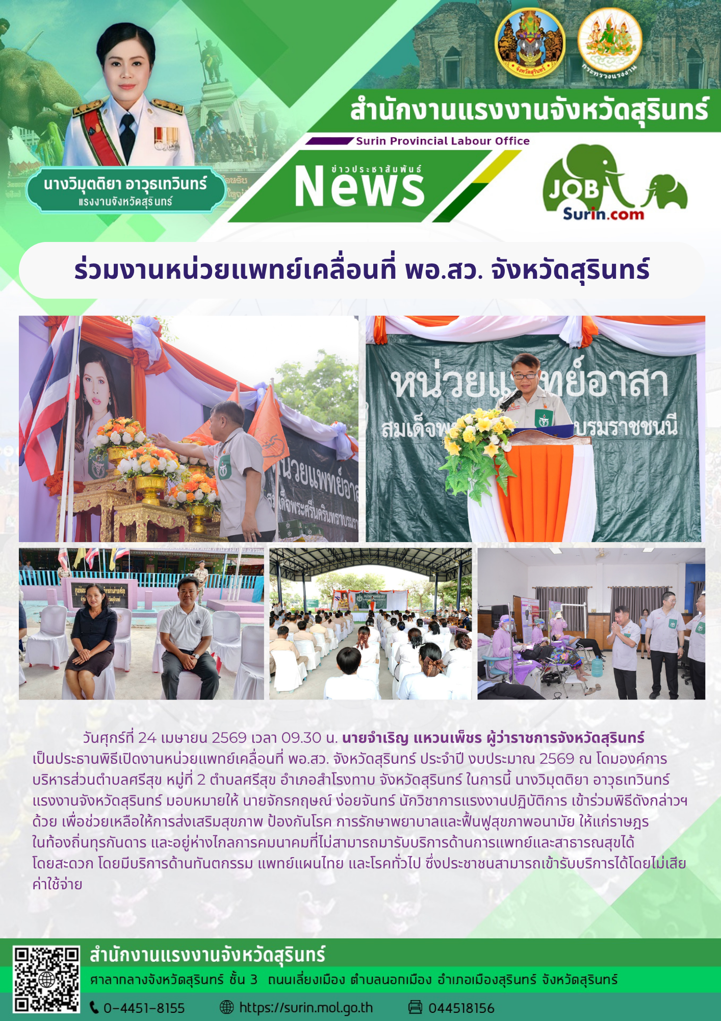 แรงงานจังหวัดสุรินทร์ ร่วมงานหน่วยแพทย์เคลื่อนที่ พอ.สว. จังหวัดสุรินทร์