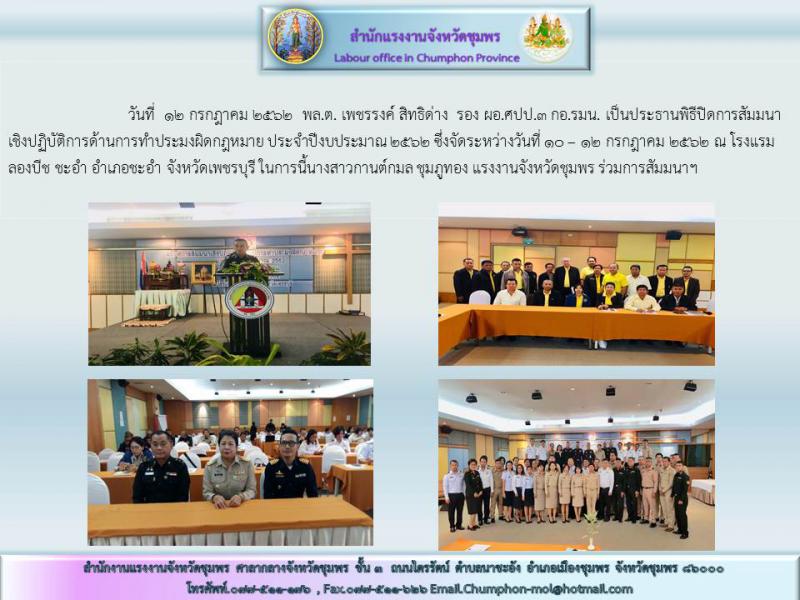 แรงงานจังหวัดชุมพร ร่วมพิธีปิดการสัมมนาชิงปฏิบัติการด้านการทำประมงผิดกฎหมาย ประจำปีงบประมาณ 2562