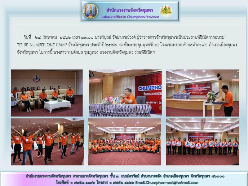 แรงงานจังหวัดชุมพร ร่วมพิธีเปิดการอบรม TO BE NUMBER ONE CAMP จังหวัดชุมพร ประจำปี 2562