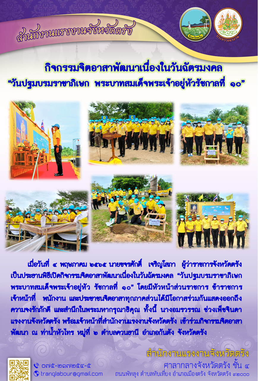 แรงงานจังหวัดตรังพร้อมด้วยเจ้าหน้าที่สำนักงานแรงงานจังหวัดตรังร่วมกิจกรรมจิตอาสาพัฒนาเนื่องในวันฉัตรมงคล “วันปฐมบรมราชาภิเษก พระบาทสมเด็จพระเจ้าอยู่หัว รัชกาลที่ 10”