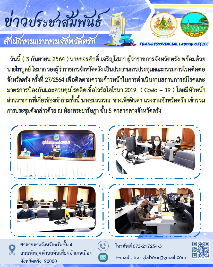 แรงงานจังหวัดตรังร่วมการประชุมคณะกรรมการโรคติดต่อจังหวัดตรัง ครั้งที่ 27/2564 เพื่อติดตามความก้าวหน้าในการดำเนินงานสถานการณ์โรคและมาตรการป้องกันและควบคุมโรคติดเชื้อไวรัสโคโรนา 2019 (Covid – 19)
