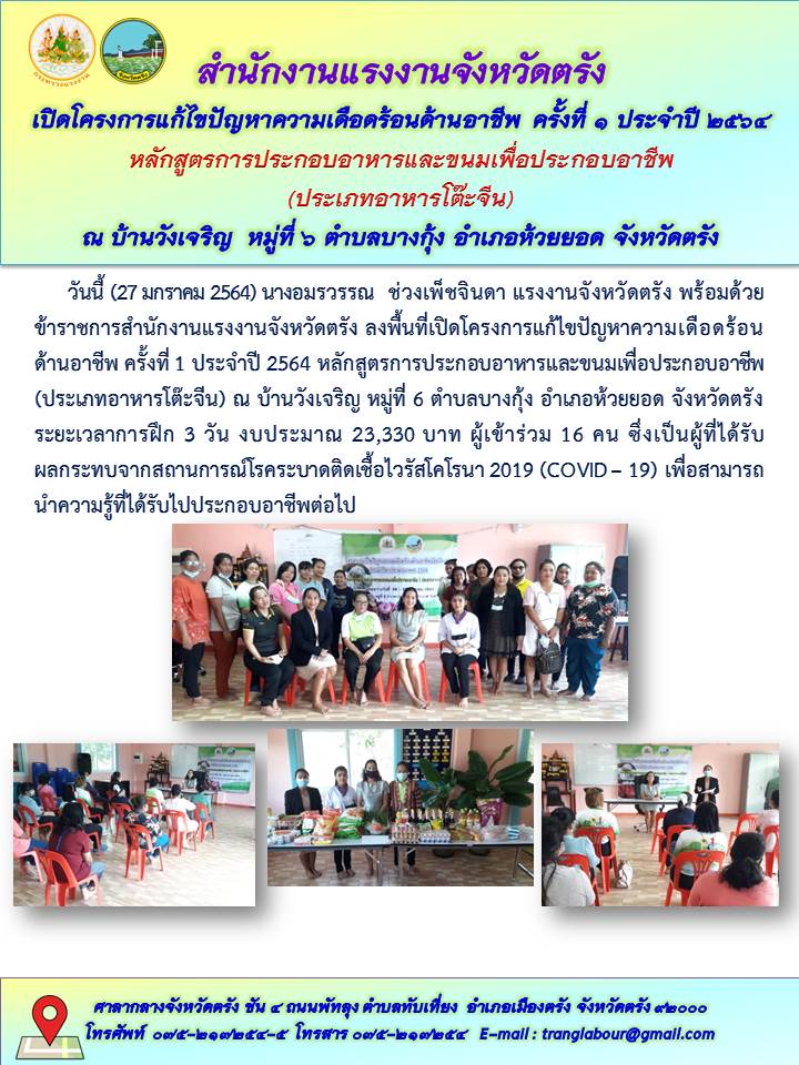 แรงงานจังหวัดตรังเปิดโครงการแก้ไขปัญหาความเดือดร้อนด้านอาชีพ ครั้งที่ 1 ประจำปี 2564หลักสูตรการประกอบอาหารและขนมเพื่อประกอบอาชีพ (ประเภทอาหารโต๊ะจีน)ณ บ้านวังเจริญ หมู่ที่ 6 ตำบลบางกุ้ง อำเภอห้วยยอด จังหวัดตรัง