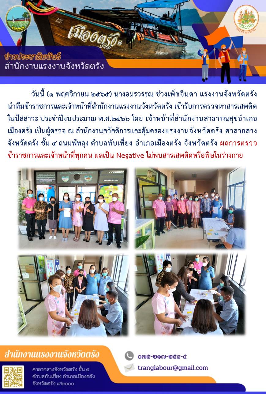 แรงงานจังหวัดตรัง นำทีมข้าราชการและเจ้าหน้าที่สำนักงานแรงงานจังหวัดตรัง เข้ารับการตรวจหาสารเสพติดในปัสสาวะ ประจำปีงบประมาณ พ.ศ.2566