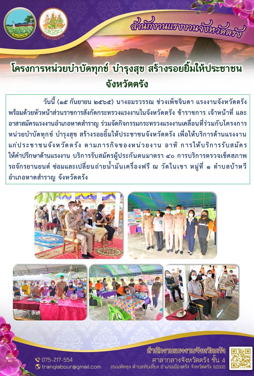 แรงงานจังหวัดตรัง พร้อมด้วยหัวหน้าส่วนราชการสังกัดกระทรวงแรงงานในจังหวัดตรัง ข้าราชการ เจ้าหน้าที่ และอาสาสมัครแรงงานอำเภอหาดสำราญ ร่วมจัดกิจกรรมกระทรวงแรงงานเคลื่อนที่ร่วมกับโครงการหน่วยบำบัดทุกข์ บำรุงสุข สร้างรอยยิ้มให้ประชาชนจังหวัดตรัง